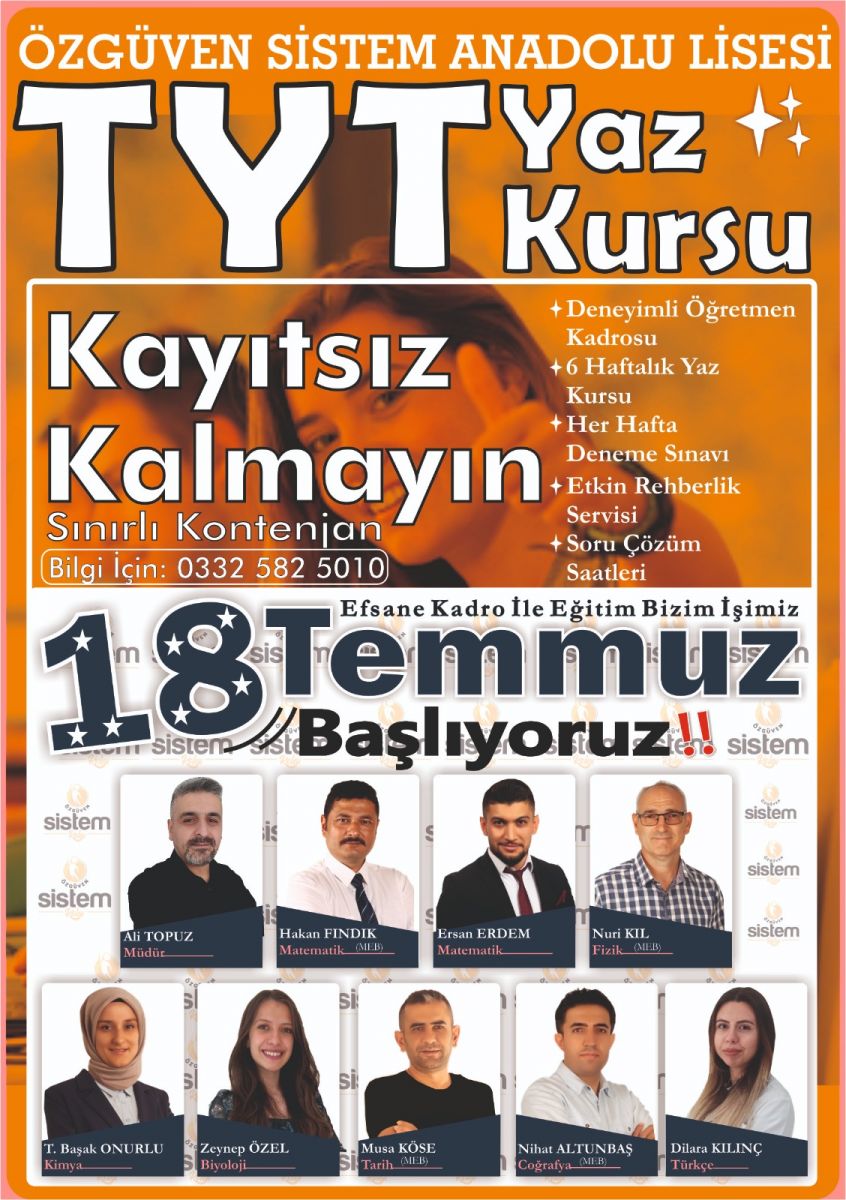 2022 yılı LGS’deilçe 1. ve 3.sünü çıkararak başarılı bir yıla daha imza atan Özgüven Sistem Koleji, aynı başarıyı 2023 YKS için de hedefliyor. Ses getiren kadrosuyla öğrencilerini sınav maratonuna hazırlayan Özgüven Sistem Koleji, 6 haftalık yaz kursunda “akademik dersler, haftalık deneme sınavları, soru çözümleri ve etkin rehberlik servisi” ile yaza damgasını vurmayı planlıyor. 18 Temmuz Pazartesi günü başlayan TYT yaz kursu şimdiden büyük talep görüyor.