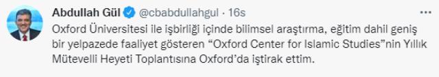 Abdullah Gül Twitter'dan yaptığı paylaşımda, "Oxford Üniversitesi ile işbirliği içinde bilimsel araştırma, eğitim dahil geniş bir yelpazede faaliyet gösteren 'Oxford Center for Islamic Studies'nin Yıllık Mütevelli Heyeti Toplantısına Oxford'da iştirak ettim" ifadelerini kullandı. Gül paylaşımına fotoğraflar da ekledi.