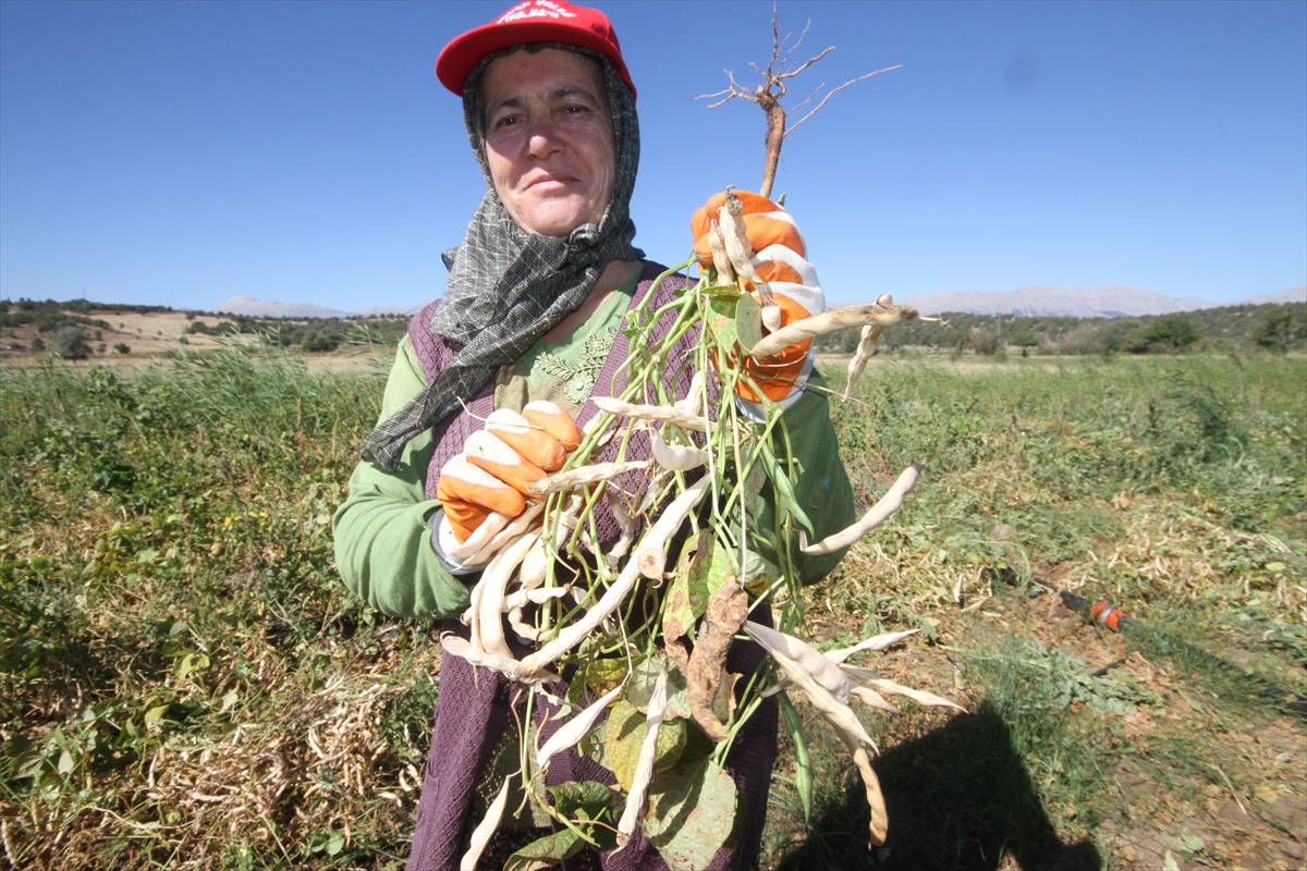 Tarlada fasulye hasadı yapan Meliha Akkaş, geleneksel yöntemlerle yardımlaşarak ürünün hasadını yaptıklarını kaydetti.