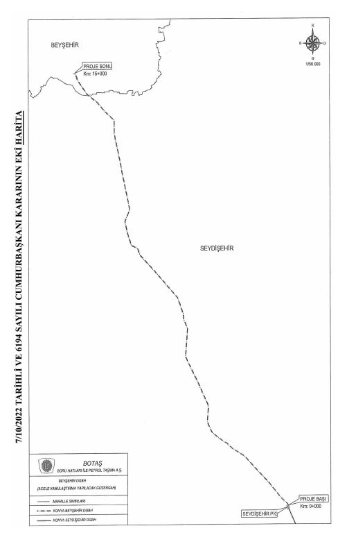 Buna göre; Beyşehir Doğal Gaz Boru Hattı Projesinin gerçekleştirilmesi amacıyla haritada gösterilen güzergâha isabet eden ve Seydişehir ilçesini de içine alan taşınmazlar ile söz konusu proje kapsamında inşa edilecek sabit tesisler, ulaşım yolları, enerji nakil hatları, katodik koruma hatları ve anot yataklarının yapımı amacıyla ihtiyaç duyulan taşınmazlar, mülkiyet şeklinde ya da daimi/geçici irtifak hakkı kurulmak suretiyle Boru Hatları ile Petrol Taşıma Anonim Şirketi Genel Müdürlüğü tarafından acele kamulaştırılacak.