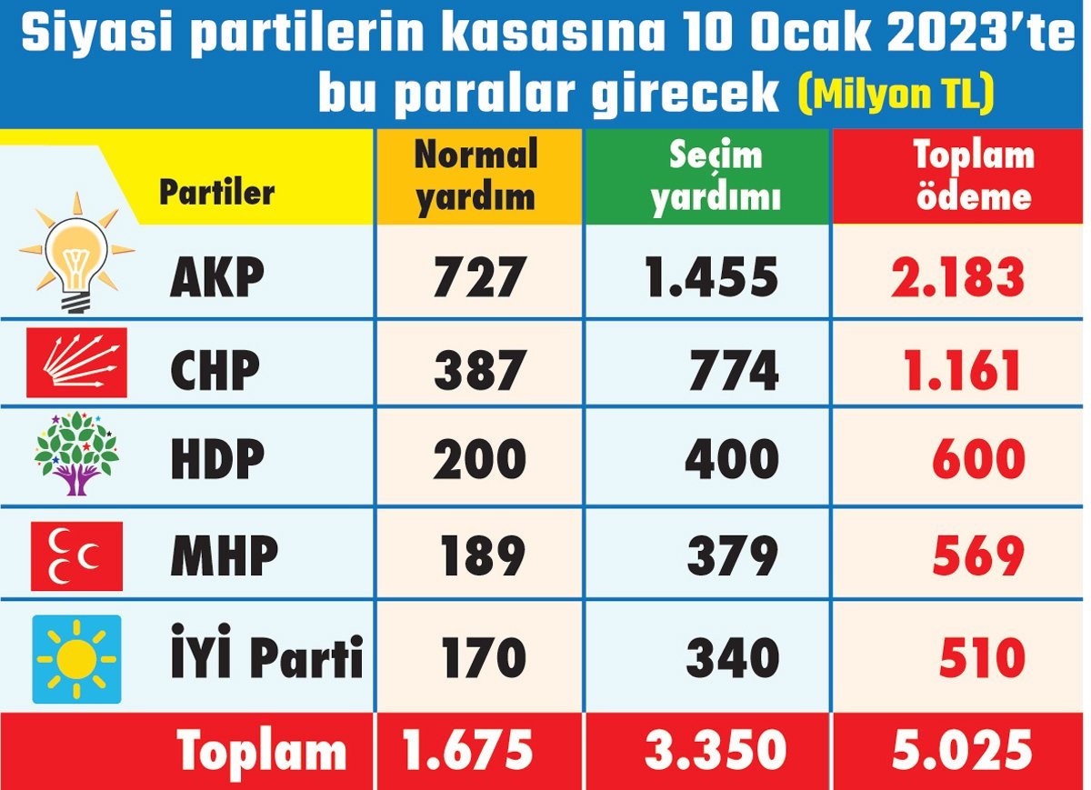 İYİ Parti'ye, en düşük yardımı alan MHP'nin yardım tutarına orantılı olarak 170 milyon 311 bin lira verilecek. Böylece toplam yardım 1 milyar 675 milyon liraya ulaşacak. Ancak, 2023 yılı seçim yılı olduğu için bu tutar 3'le çarpılarak ve siyasi partilere ödenecek toplam yardım miktarı 5 milyar 25 milyon lirayı bulacak.