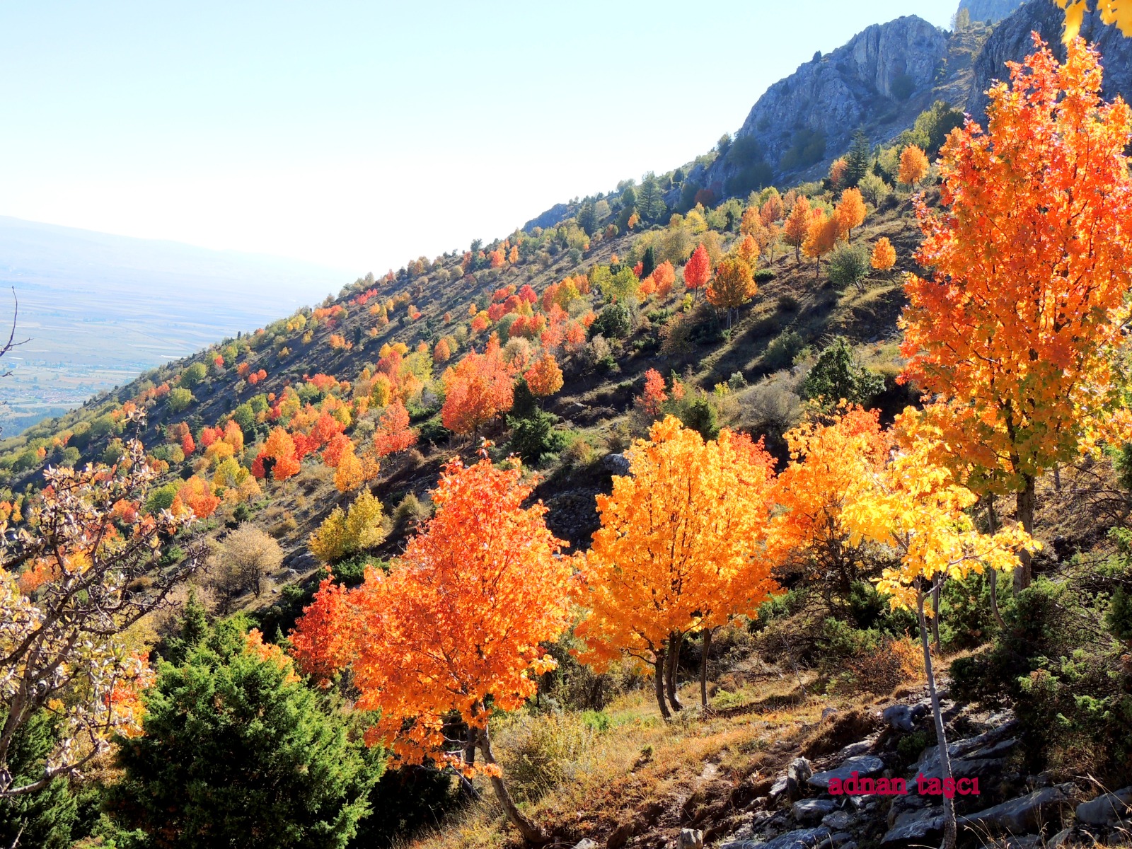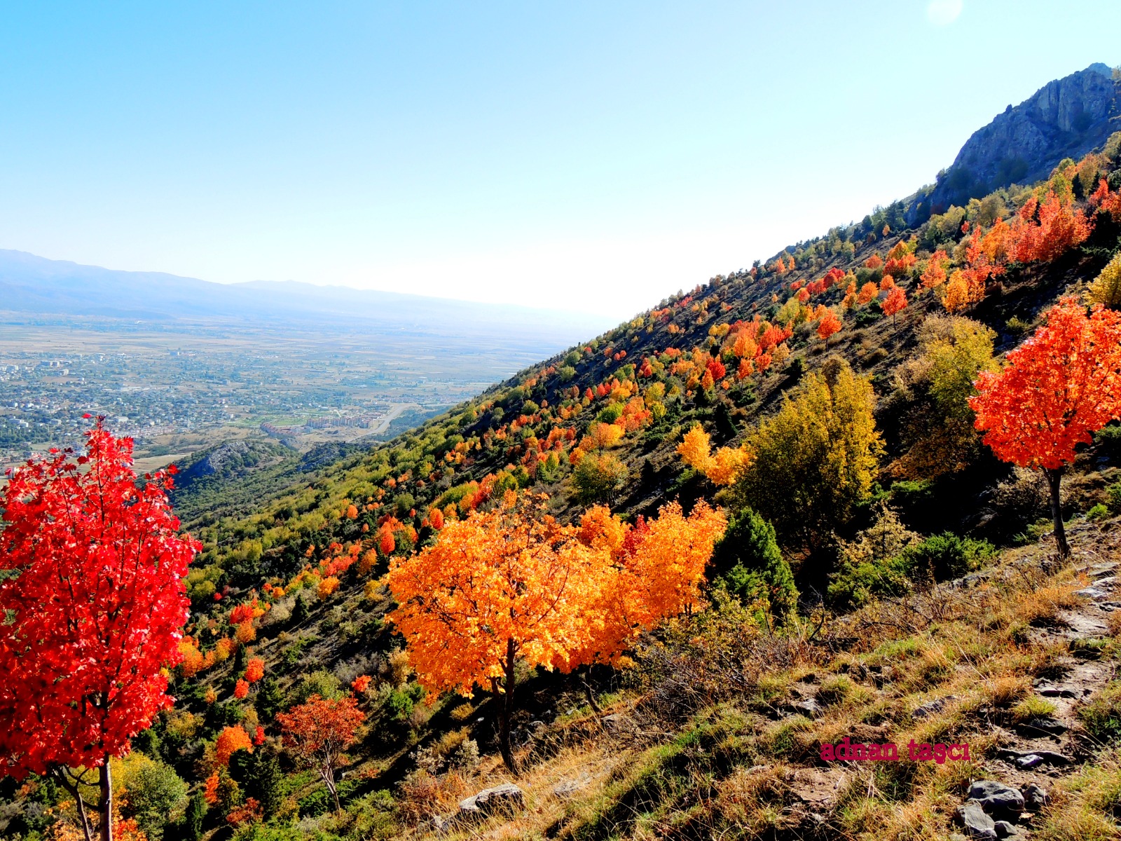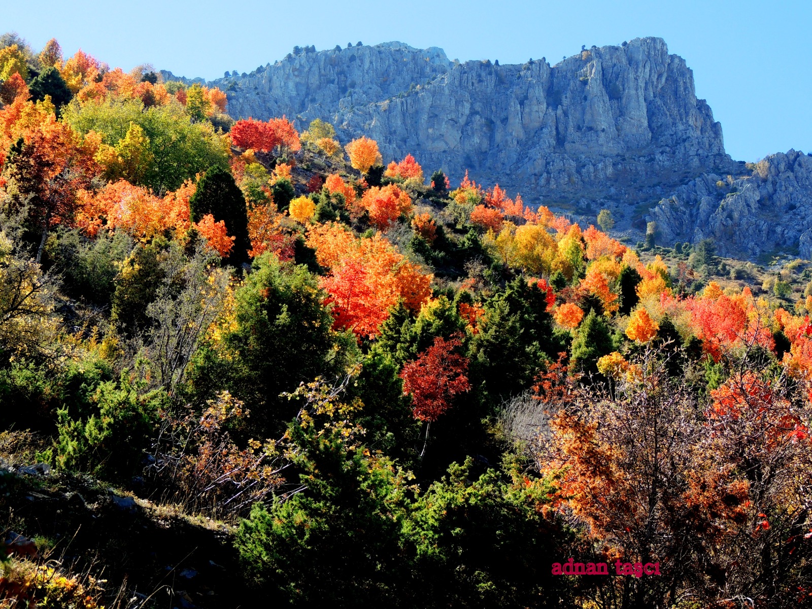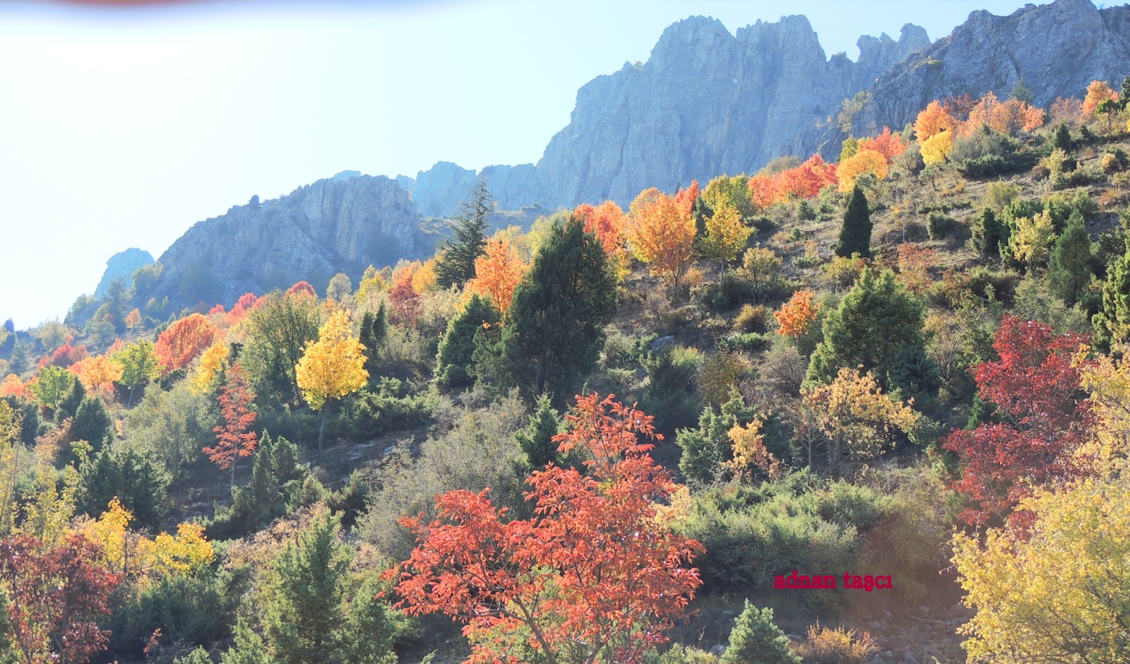 Konya’nın Seydişehir ilçesinde sonbahar mevsimi ile birlikte 2 bin 535 rakımlı Küpe dağı eteklerinde yapraklarının oluşturduğu renkler görsel şova dönüşüyor.
