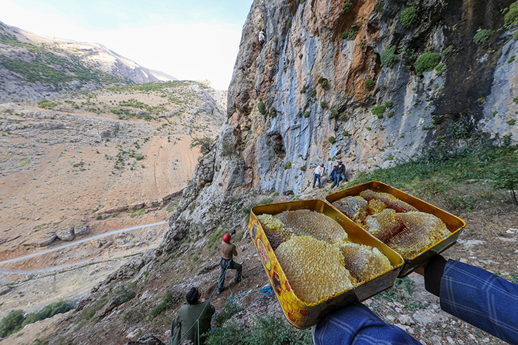 Van'ın karakovan balı ve cevizi ile ünlü Bahçesaray ilçesinde, arıların binlerce metre yükseklikteki dağların oyuklarında ürettiği "kaya balı", binbir güçlükle toplanıp satışa sunuluyor.