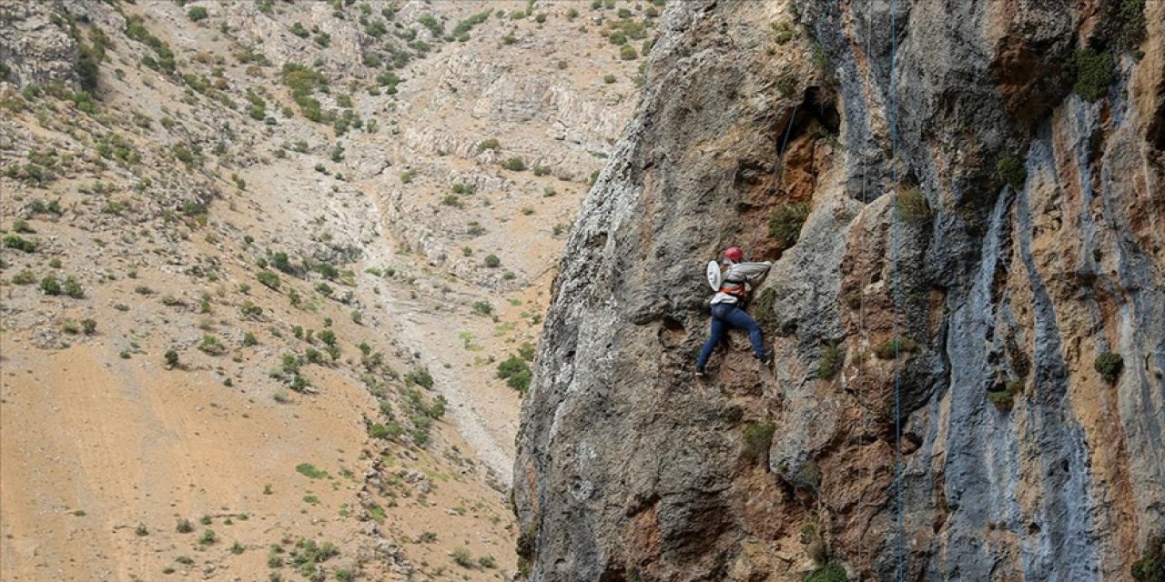 Bölgeye gelen dağcılar, güvenlik önlemlerini aldıktan sonra arıcılarla birlikte halatlarla kayalıklara tırmanarak metrelerce yükseklikteki yuvaya ulaştı.