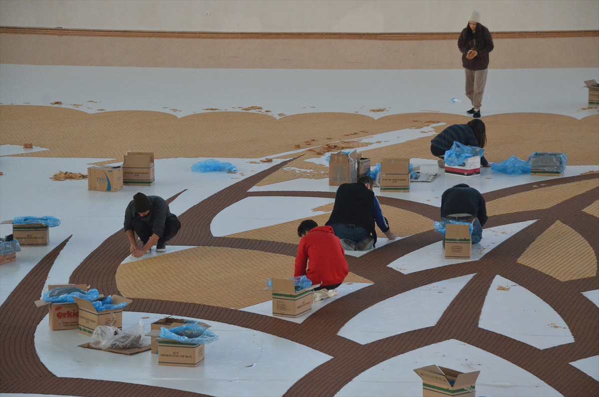 Yapılan çalışmayla 20 kişilik ekip Karamanoğlu Mehmetbey Üniversitesi (KMÜ) Taha Akgül Spor Salon zeminine 300 bin adet pötibör bisküvi kullanarak buğday başağı motifi çizecek.