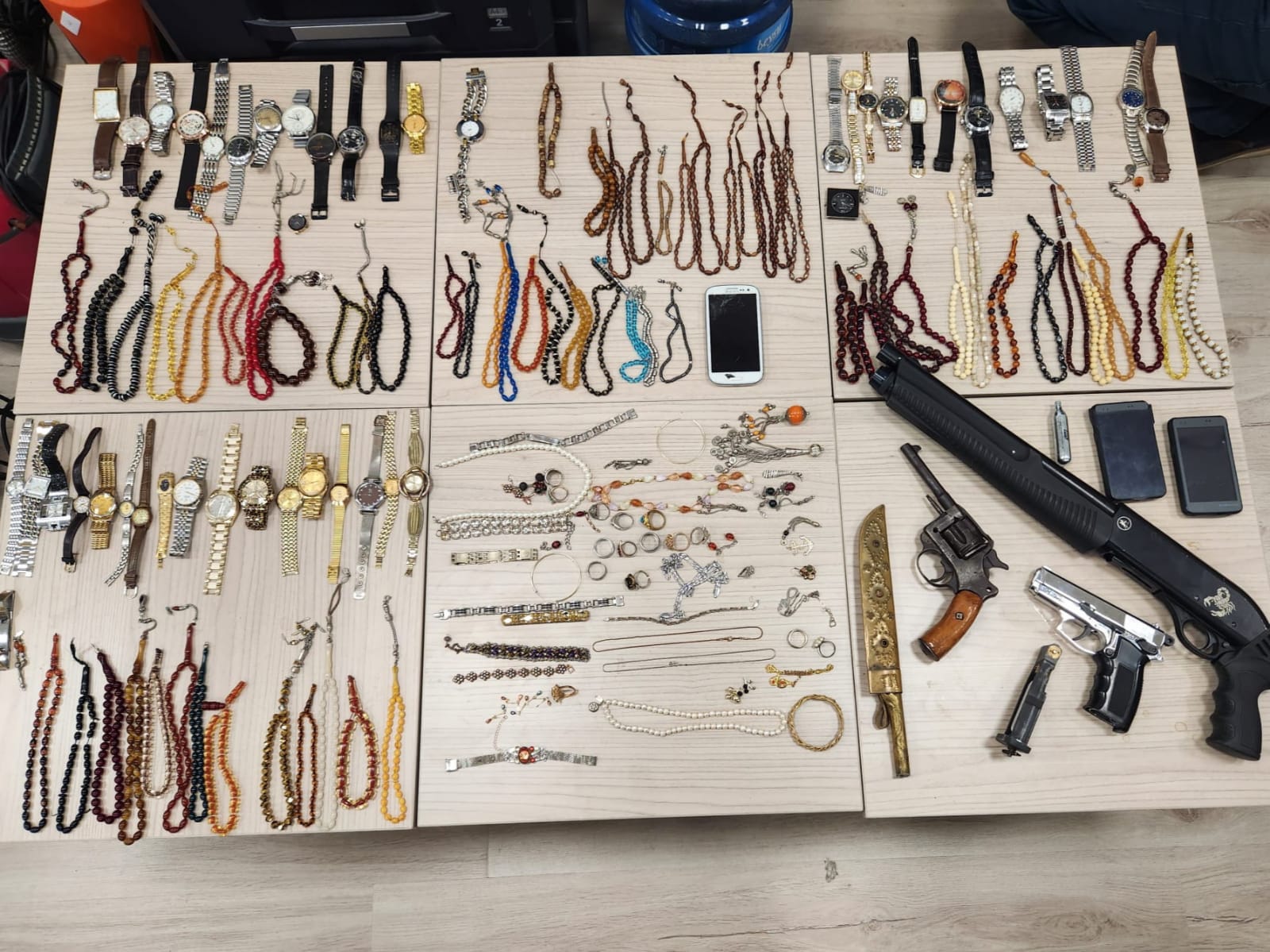 İş yerinde arama yapan ekipler oto yıkama makinesi, halı yıkama makinesi, televizyon, elektrikli süpürge, fotoğraf makinesi, oto teybi gibi çeşitli elektronik eşya, matkap, testere, çim biçme makinesi, hilti, taşlama makinesi gibi çeşitli inşaat ve tarım aletleri ve kol saati, tespih gibi toplam 167 parça eşya ele geçirdi. Ekipler ayrıca arama esnasında ele geçirdiği 1 adet pompalı tüfek, 1 adet toplu tabanca, 1 adet havalı tabanca ve tabancaya ait 1 adet şarjör ve 2 adet tüpe de el koydu.