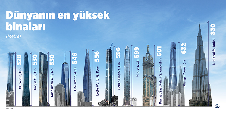 Dünyanın en yüksek 10 binası olan Burj Khalifa, Şangay Kulesi, Kraliyet Saat Kulesi, Ping An Uluslararası Finans Merkezi, Goldin Finance 117, Lotte World Tower, Guangzhou CTF Finans Merkezi, One World Trade Center (Özgürlük Kulesi), Tianjin CTF Finance Center ve China Zun gökdeleni görüntülendi.