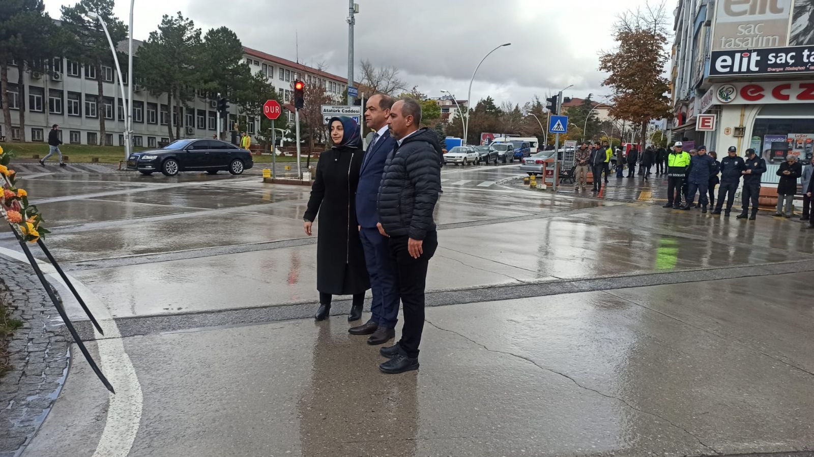 İlk Tören Hükümet Konağı önünde Atatürk Anıtı'na İlçe Milli Eğitim Müdürü Tahir Kibar tarafından çelenk sunulması saygı duruşu ve İstiklal Marşı’nın okunmasıyla başladı.