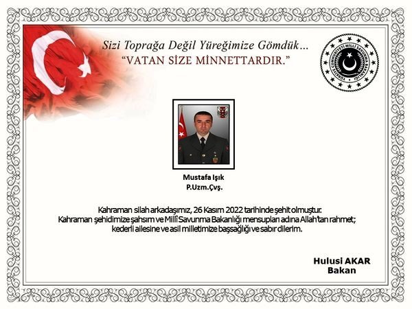 "Pençe-Kilit Harekatı bölgesinde 26 Kasım 2022 tarihinde yıldırım düşmesi sonucu yaralanan kahraman silah arkadaşımız Piyade Uzman Çavuş Mustafa Işık, yapılan tüm müdahalelere rağmen kurtarılamayarak şehit olmuştur. Bizleri derin bir acı ve üzüntüye boğan bu olayda hayatını kaybeden aziz şehidimize Allah'tan rahmet, kederli ailesine, Türk Silahlı Kuvvetleri ile asil milletimize başsağlığı ve sabır dileriz."
