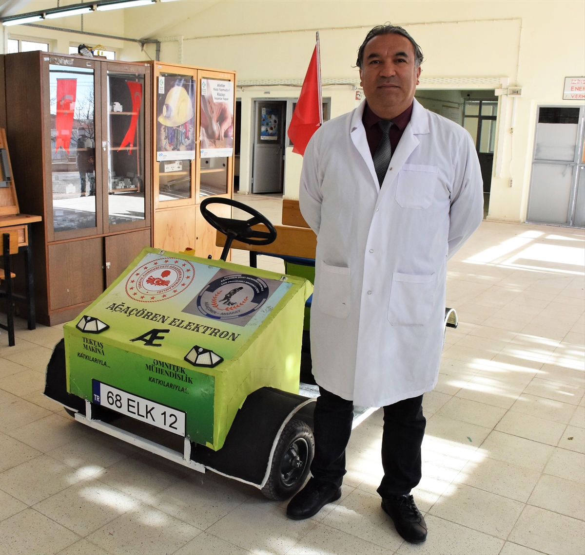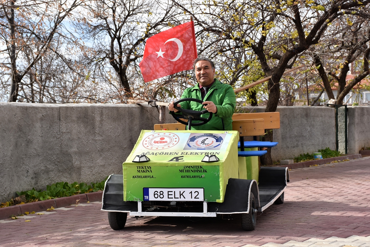 Aksaray'ın Ağaçören ilçesinde bir lisede görev yapan elektrik öğretmeni Mahmut Sinen, hurdaya ayrılan okul sıraları, el arabası tekerleği ve diğer malzemeleri kullanarak öğrencilerinin de yardımıyla 3 vitesli elektrikli araç üretti.