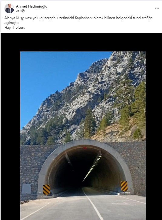 “Alanya Kuşyuvası yolu güzergahı üzerindeki Kaplanhanı olarak bilinen bölgedeki tünel trafiğe açılmıştır. Hayırlı olsun.”