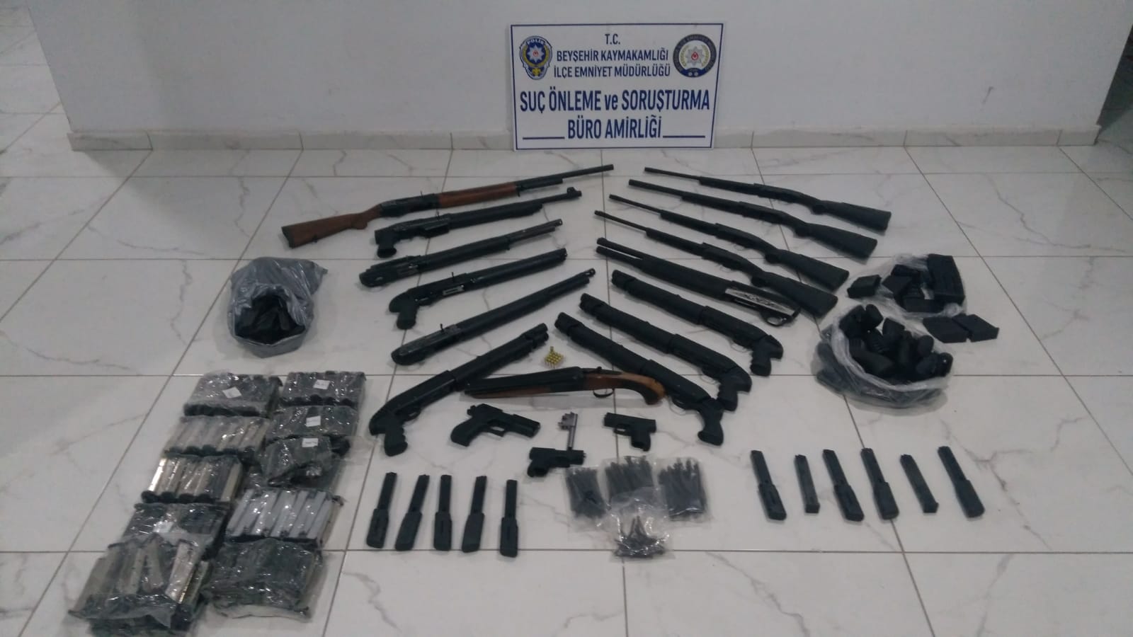 Beyşehir İlçe Emniyet Müdürlüğü Suç Önleme ve Soruşturma Büro Amirliği ekipleri de bu sırada araç içerisinde yakalanan şüphelilerin silahları teslim aldıkları Beyşehir’de bir iş yerine operasyon düzenledi. İş yerinde yapılan aramada 2 adet tabanca, 5 adet kısa namlulu pompalı tüfek, 5 adet otomatik av tüfeği, 4 adet tek kırma av tüfeği, 1 adet çifte av tüfeği, 17 adet tabanca fişeği, 1 adet kurusıkı tabanca, 1 adet ucu açılmış tabanca namlusu, 265 adet tabanca şarjörü, 8 adet av tüfeği şarjörü ve 183 adet av tüfeği parçası ele geçirildi.