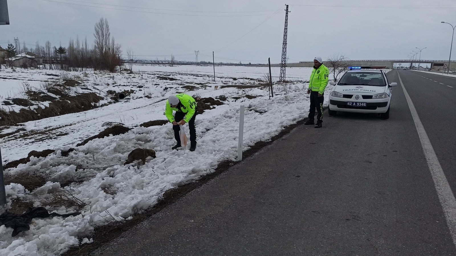 Konya’ nın Seydişehir ilçesinde devriye görevi yürüten trafik ekibi yol kenarında gördükleri yavru köpekleri beslediler.