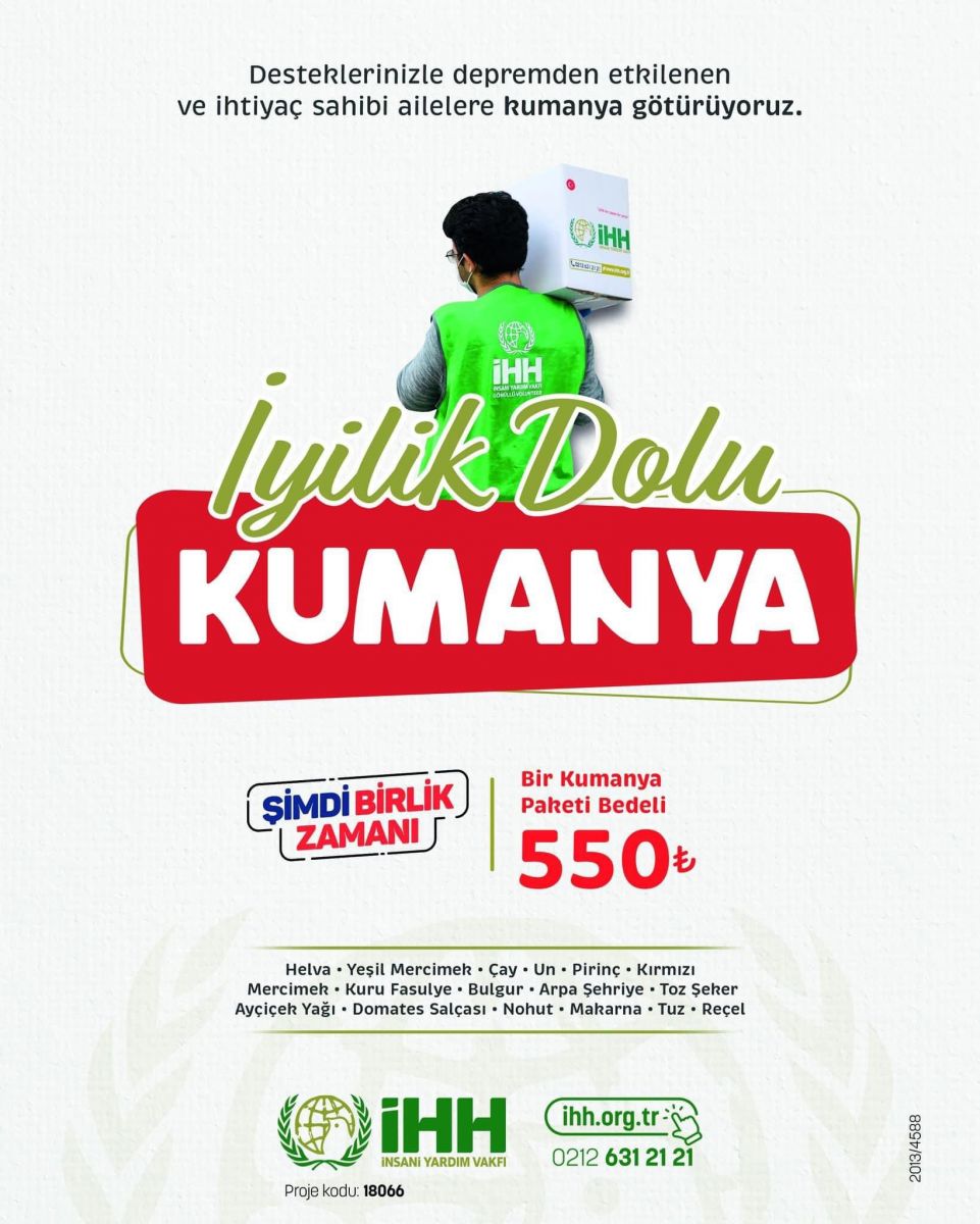 Seydişehir IHH Temsilciliği olarak desteklerinizle, depremden etkilenen ve ihtiyaç sahibi ailelere kumanya götürüyoruz.