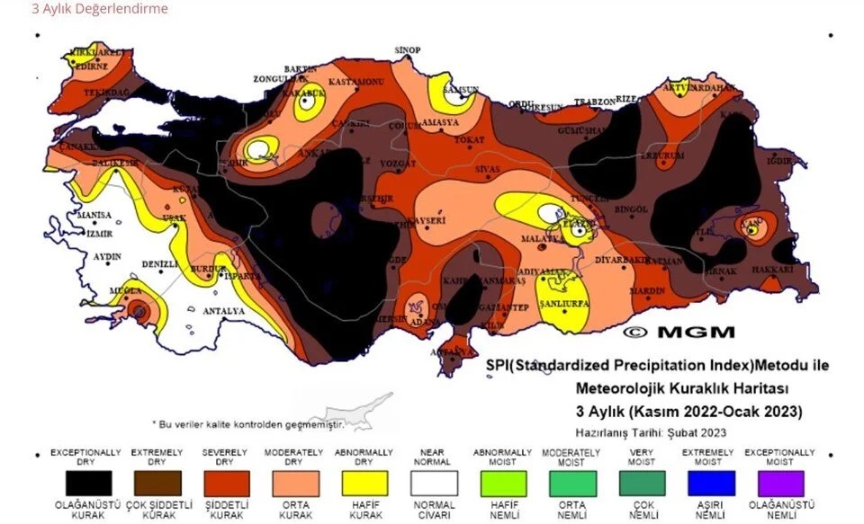 Standart Yağış İndeksi (SPI) metoduna göre hazırlanan 3 aylık haritada birçok il olağanüstü kuraklık durumu dikkat çekti.