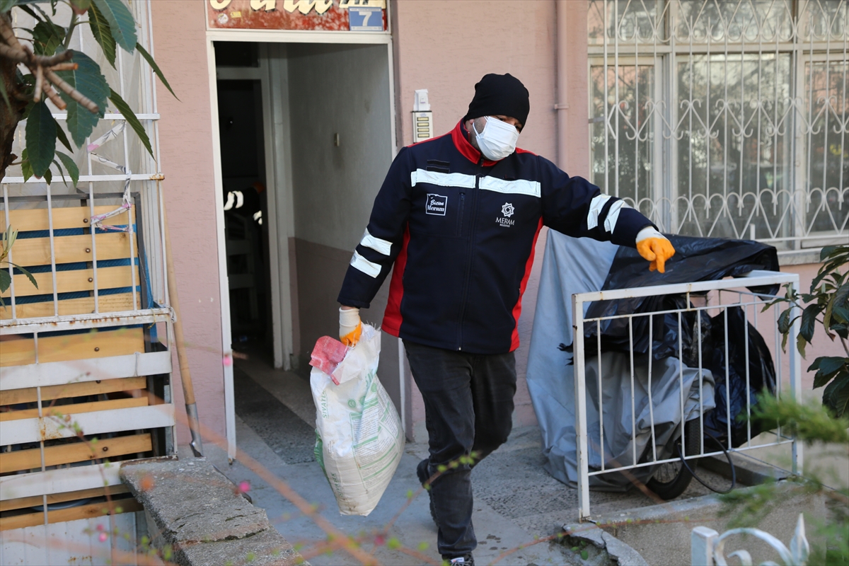 Meram Belediyesi Çevre Koruma ve Kontrol Müdürlüğü ekipleri, evdeki çöpleri kamyonlara doldurarak, dezenfeksiyon işlemi gerçekleştirdi.
