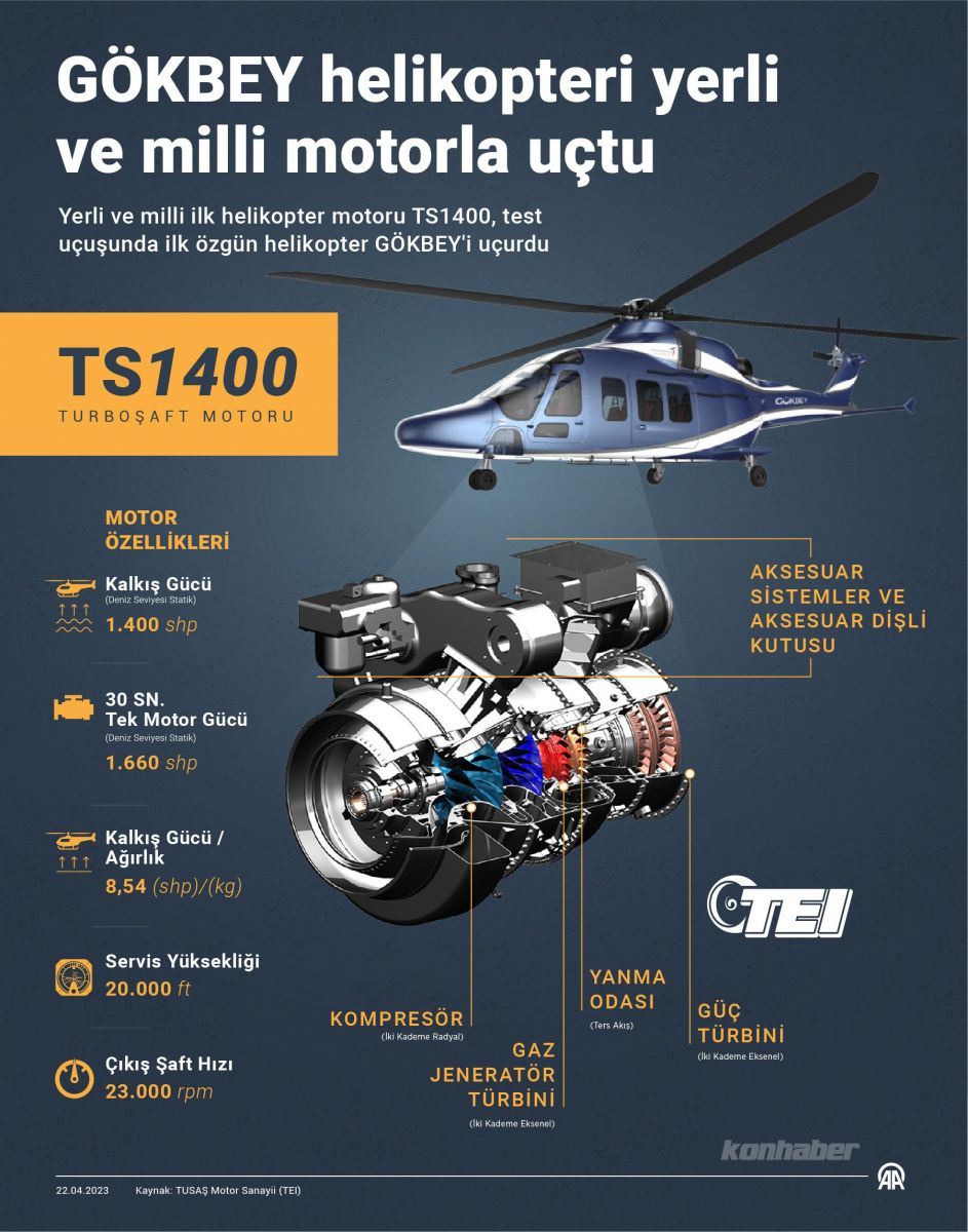 Türk Havacılık ve Uzay Sanayii tarafından geliştirilen ilk yerli genel maksat helikopteri Gökbey, milli helikopter motoru TEI-TS1400 ile havalandı.