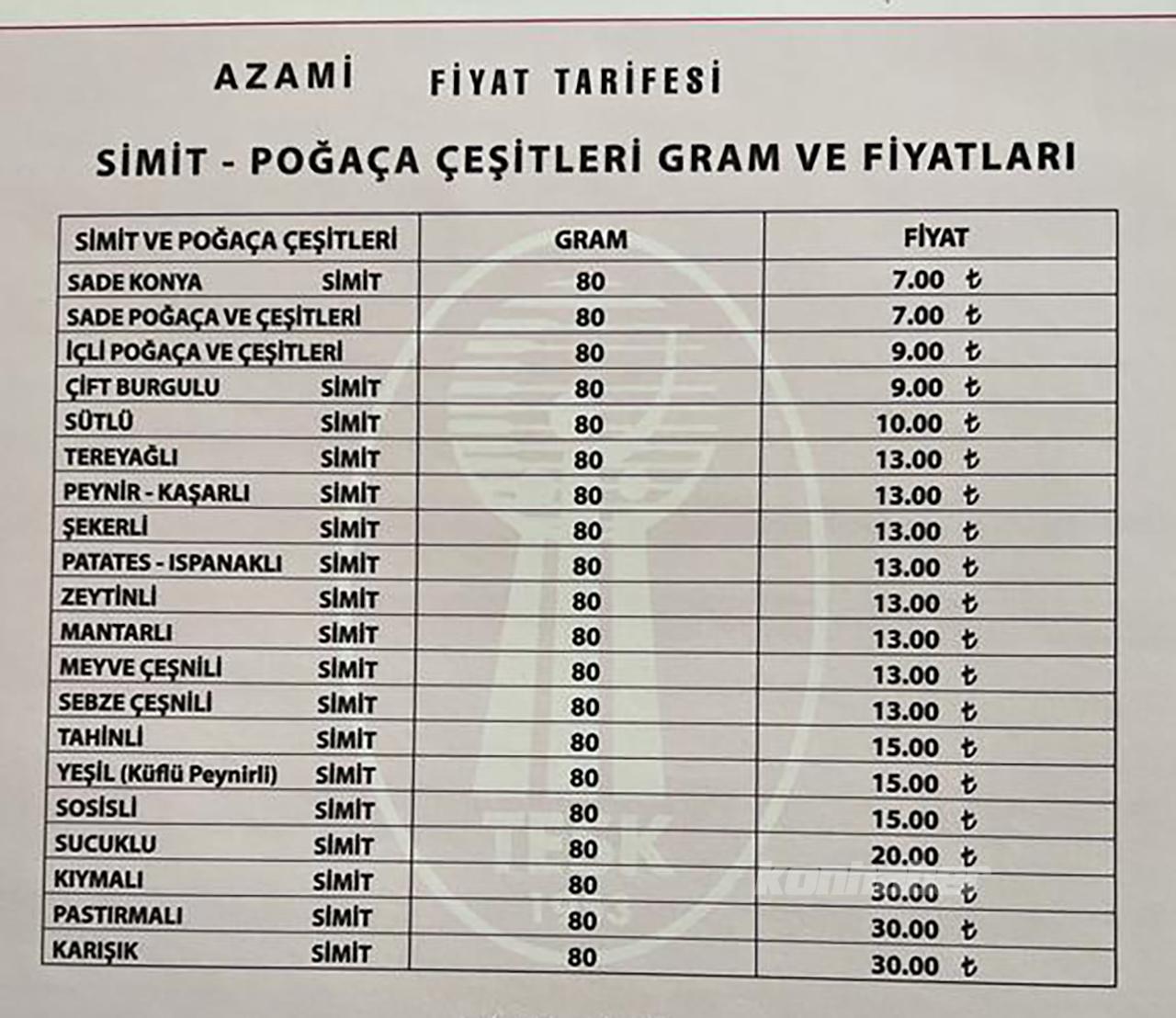 Konya simidi olarak bilinen sade simidin fiyatı 2 lira birden attı. Daha önce 5 liraya satılan sade simidin fiyatı, yeni zamla birlikte 7 liraya yükseltildi. Tereyağlı simit ise 13 lira oldu. Çift burgulu simit 9 lira; sütlü simit 10 lira; peynirli, kaşarlı, şekerli, patatesli, ıspanaklı, zeytinli, mantarlı, meyve çeşnili ve sebze çeşnili simit 13 lira; tahinli, küflü peynirli ve sosisli simit 15 lira; sucuklu simit 20 lira; kıymalı, pastırmalı ve karışık simit ise 30 lira oldu.
