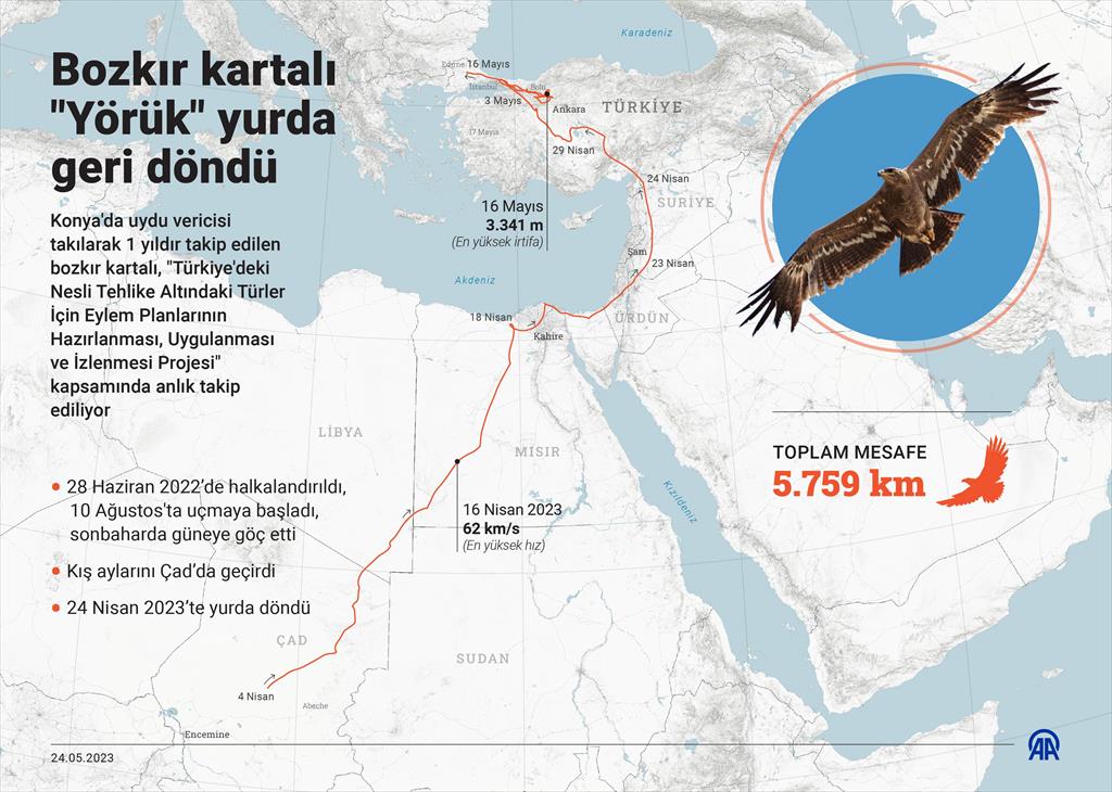 Konya'da uydu vericisi takılan ve nesli tehlike altında olan "Yörük" adlı bozkır kartalı, kışı Çad, Nijerya ve Sudan'da geçirdikten sonra tekrar doğduğu topraklara döndü.