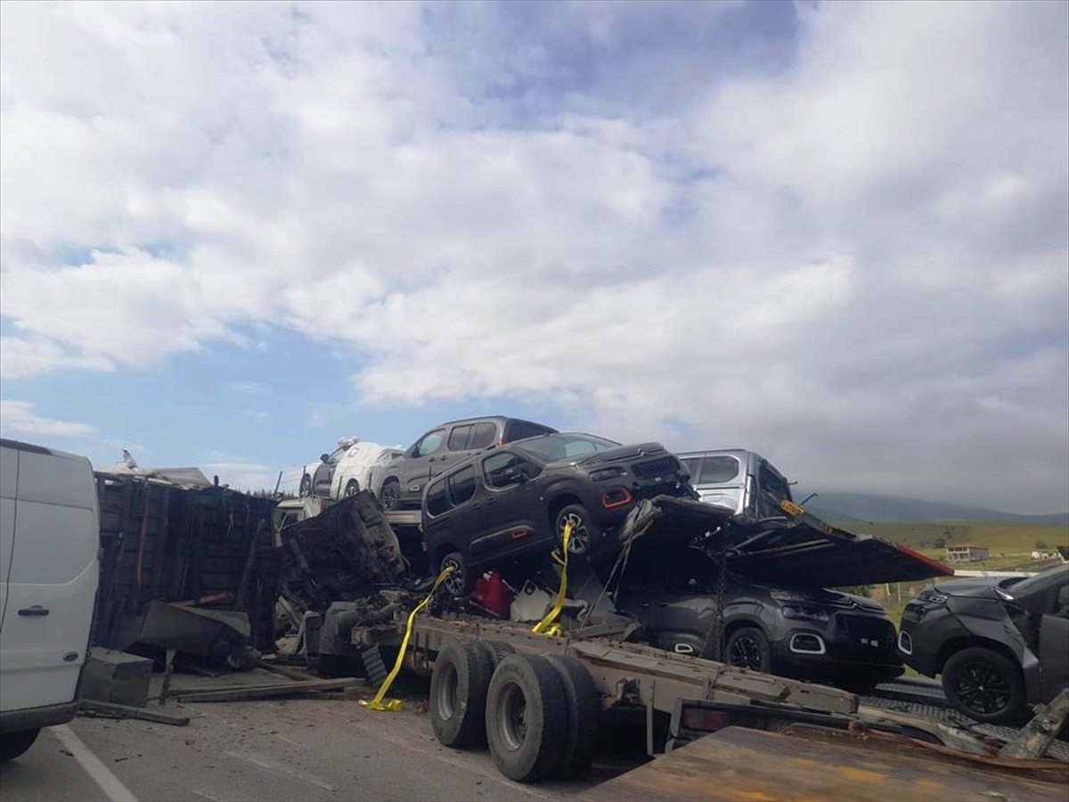 Çarpmanın şiddetiyle tırda yüklü bulunan hafif ticari araçlar, yola devrildi. İhbar üzerine kaza yerine polis ve sağlık ekipleri sevk edildi.