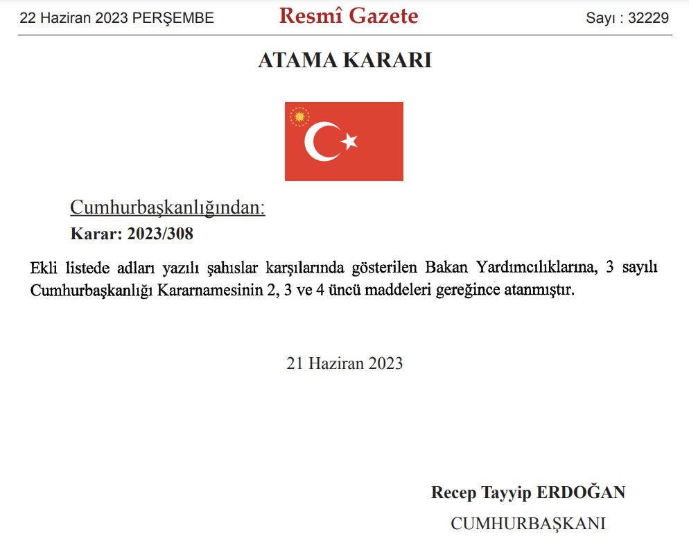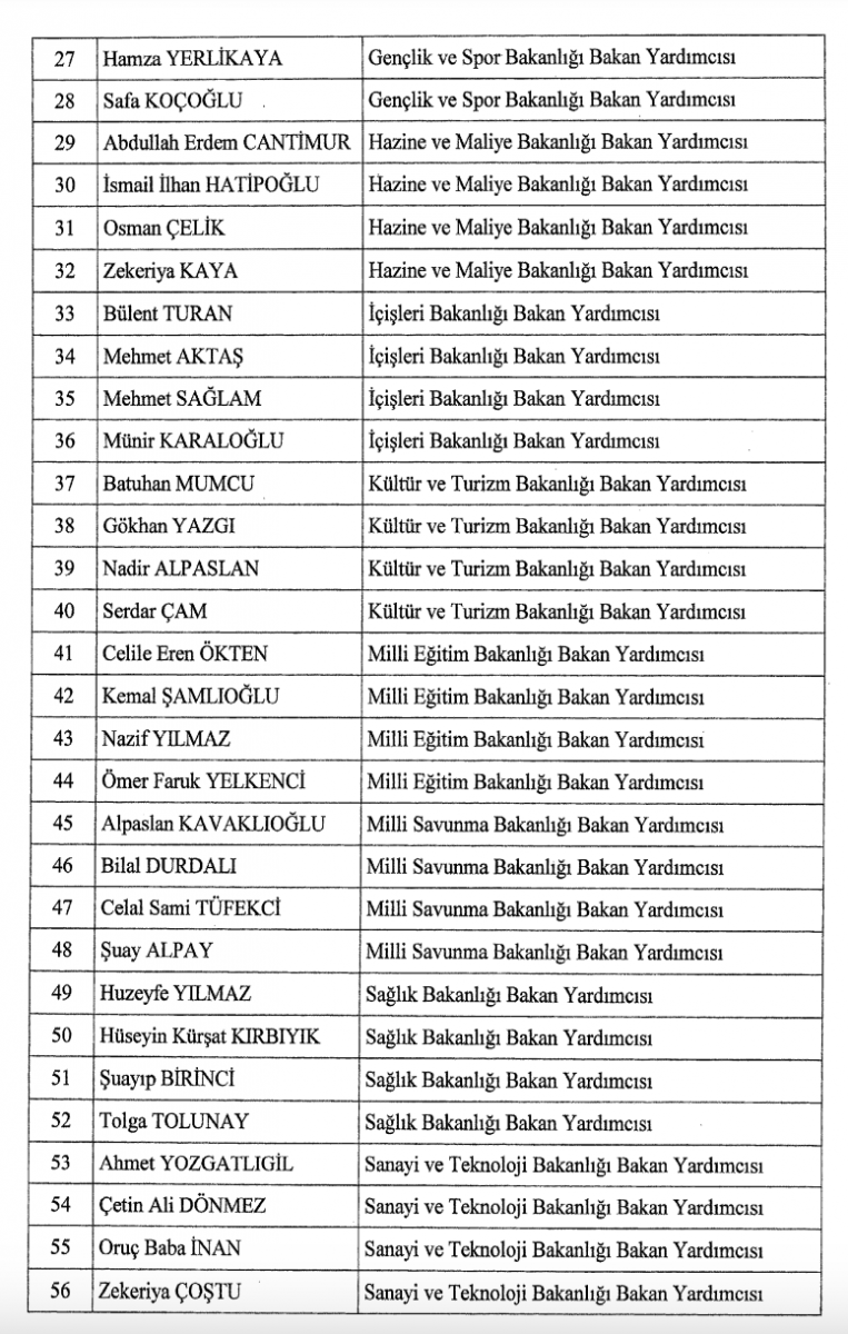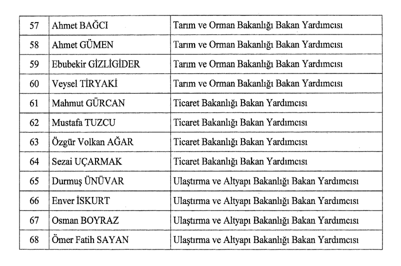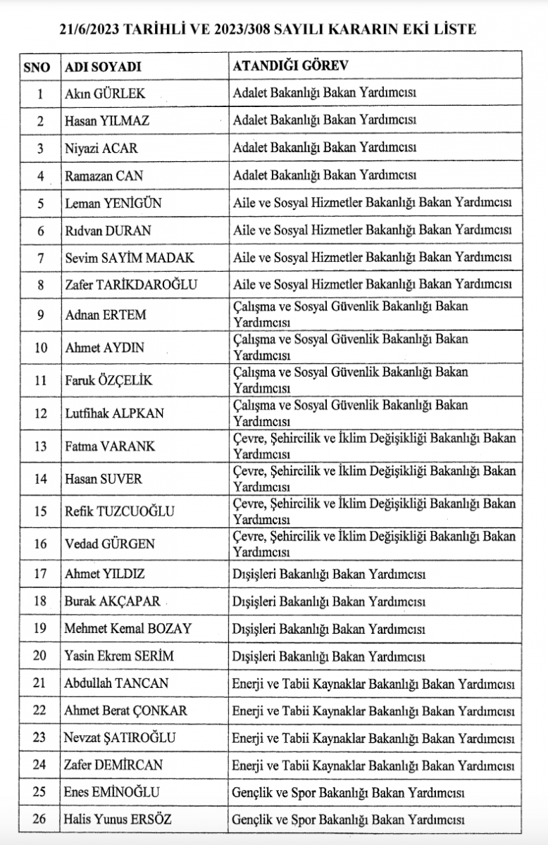 Cumhurbaşkanı Recep Tayyip Erdoğan'ın bakan yardımcılıklarına atama kararları Resmi Gazete'de yayımlandı. Buna göre Konyalı isim Refik Tuzcuoğlu Çevre, Şehircilik ve İklim Değişikliği Bakanlığı bakan yardımcılığına atanırken, Faruk Özçelik ise Çalışma ve Sosyal Güvenlik Bakanlığı bakan yardımcısı olarak atandı.Sağlık Bakanlığı Bakan Yardımcılığı görevine atanan Edirne Valimiz kıymetli hemşehrimiz H. Kürşat Kırbıyık' atandı.