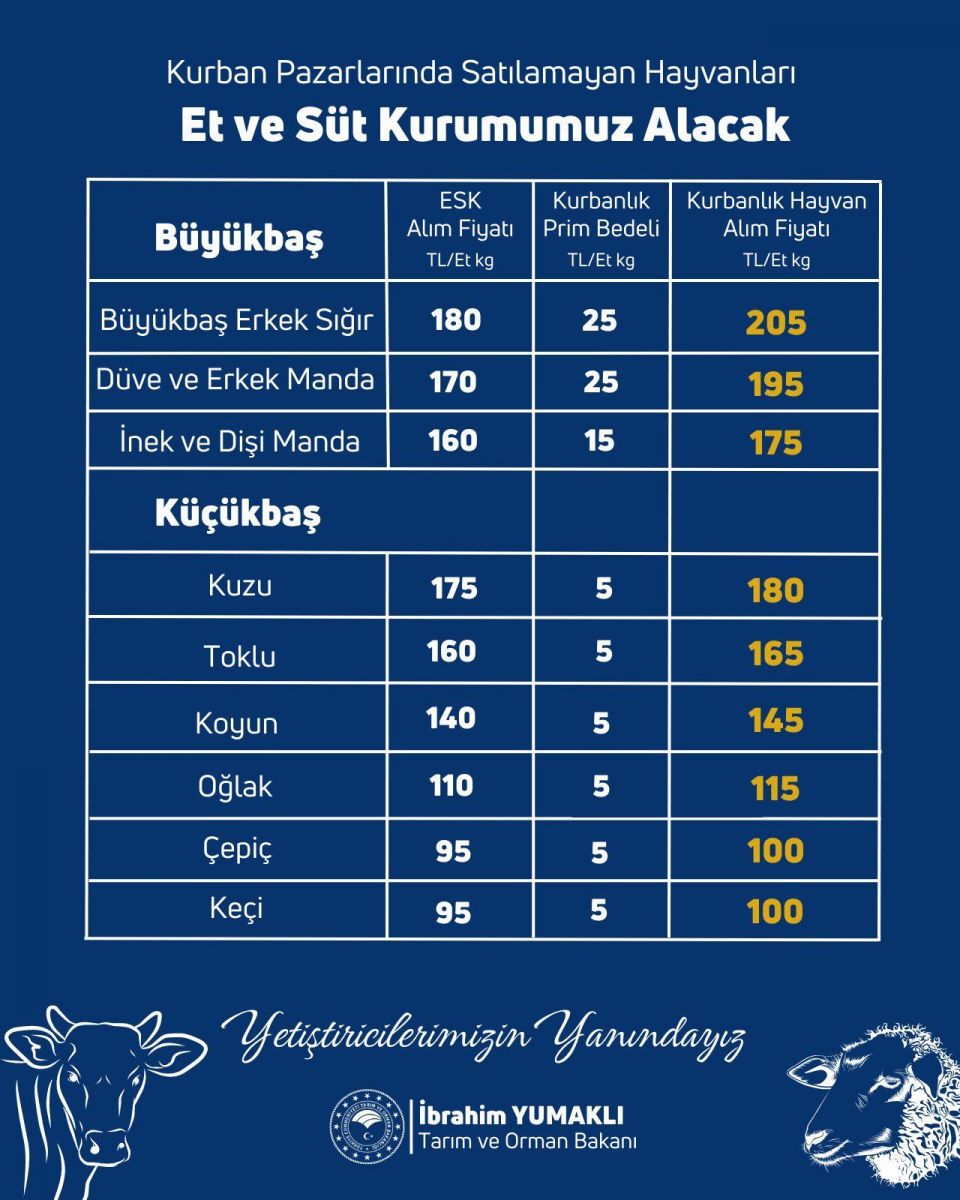 Tarım ve Orman Bakanı İbrahim Yumaklı'nın yayımladığı mesajda ayrıca ESK Kurbanlık Fiyatı, Kurbanlık Prim Bedeli, Kurbanlık Hayvan Alım Fiyatına ilişkin bilgilere yer verdi.