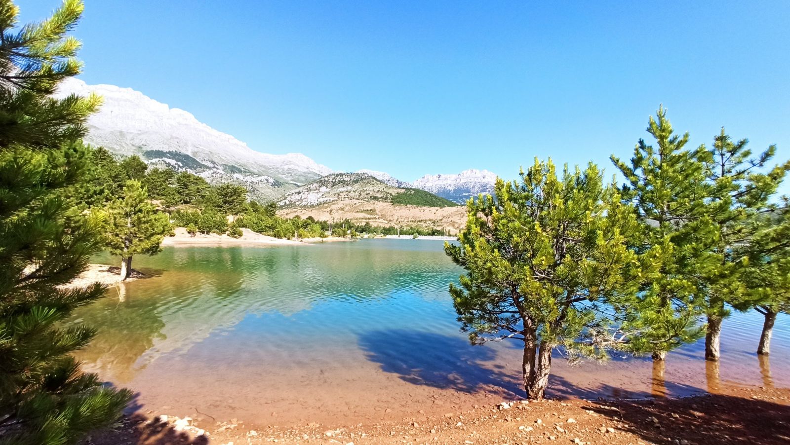 Konyanın Seydişehir ilçesinde bulunan Küpe Dağının kar suları ile dolan Tarasçı Baraj Gölü, görenleri büyülüyor.