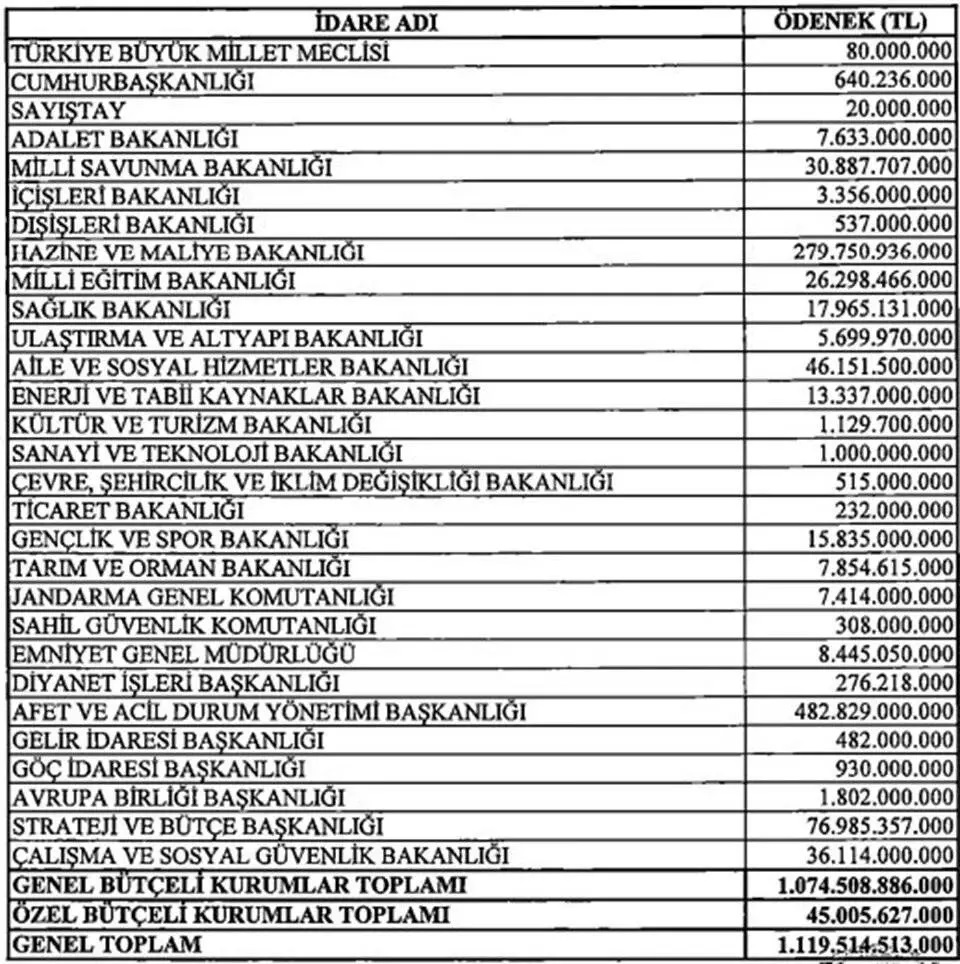 İkinci en yüksek ödenek 279 milyar 750 milyon 936 TL ile Hazine ve Maliye Bakanlığı'na ayrıldı.