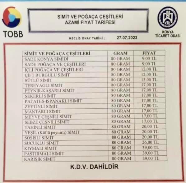 Konya simidi olarak bilinen sade simidin fiyatı yeni zamla birlikte 9 liraya yükseltildi. Tereyağlı simit ise 17 lira oldu. Çift burgulu simit 12 lira; sütlü simit 13 lira; peynirli, kaşarlı, şekerli, patatesli, ıspanaklı, zeytinli, mantarlı, meyve çeşnili ve sebze çeşnili simit 17 lira; tahinli, küflü peynirli ve sosisli simit 20 lira; sucuklu simit 26 lira; kıymalı, pastırmalı ve karışık simit ise 39 lira oldu.