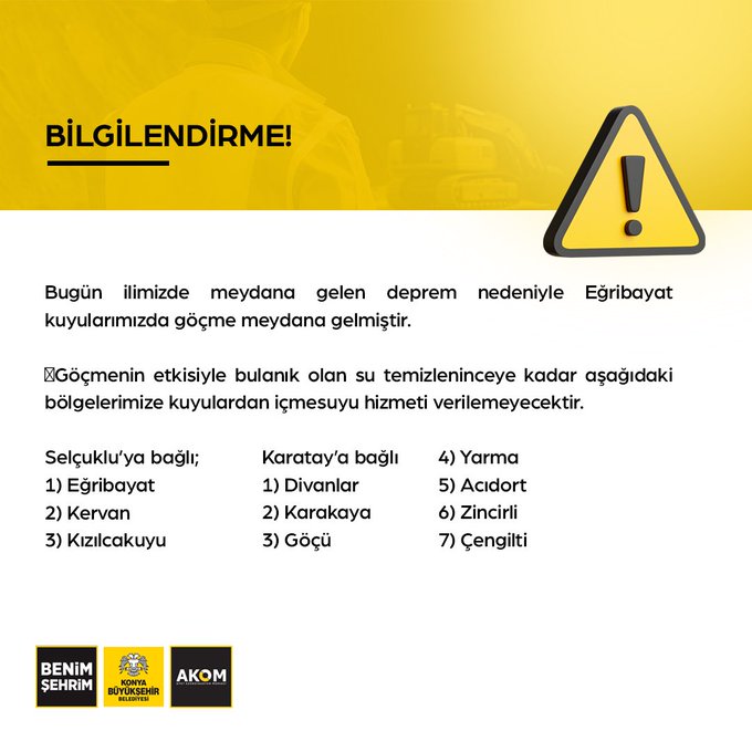 Konya'da 5 büyüklüğünde deprem meydana geldi. Kentte korkuya neden olan deprem nedeniyle Eğribayat grup su kuyularında göçme meydana geldi. Konuya ilişkin açıklama yapan AKOM, bazı bölgelere kuyulardan içme suyu verilmeyeceğini açıkladı.