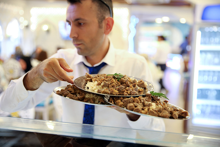 Konya'da bir girişimci, kentin geleneksel düğün pilavı menüsünü tarihi hamam manzaralı işletmesinde müşterilerine sunuyor.