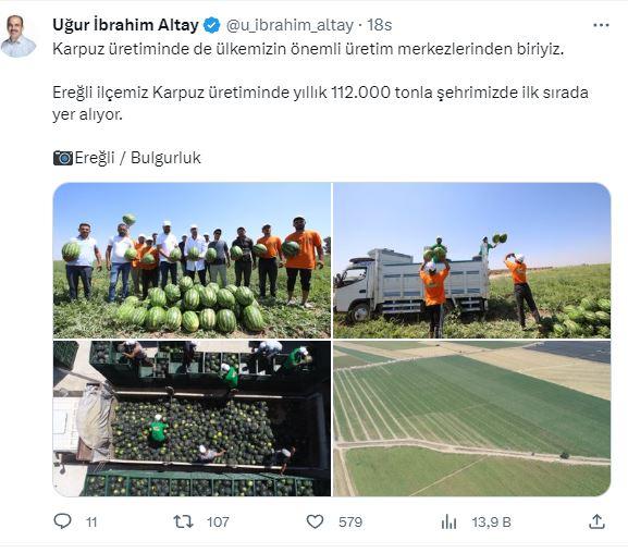 Altay'ın sosyal medya hesabından yaptığı paylaşımda; "Karpuz üretiminde de ülkemizin önemli üretim merkezlerinden biriyiz. Ereğli ilçemiz Karpuz üretiminde yıllık 112.000 tonla şehrimizde ilk sırada yer alıyor'' açıklamalarında bulundu.