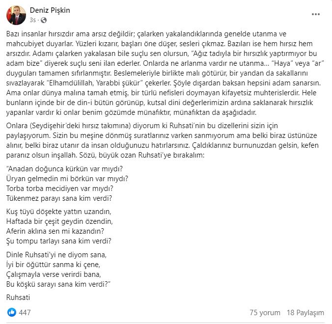 - Şöyle dışardan baksan hepsini adam sanırsın. Ama onlar dünya malına tamah etmiş, bir türlü nefisleri doymayan kifayetsiz muhterislerdir. Hele bunların içinde bir de dini bütün görünüp, kutsal dini değerlerimizin ardına saklanarak hırsızlık yapanlar vardır ki onlar benim gözümde münafıktır, münafıktan da aşağıdadır. Onlara (Seydişehir'deki hırsız takımına) diyorum ki Ruhsati'nin bu dizellerini sizin için paylaşıyorum. Sizin bu meşine dönmüş suratlarınız varken sanmıyorum ama belki biraz üstünüze alınır, belki biraz utanır da insan olduğunuzu hatırlarsınız. Çaldıklarınız burnunuzdan gelsin, kefen paranız olsun inşallah. Sözü, büyük ozan Ruhsati'ye bırakalım: