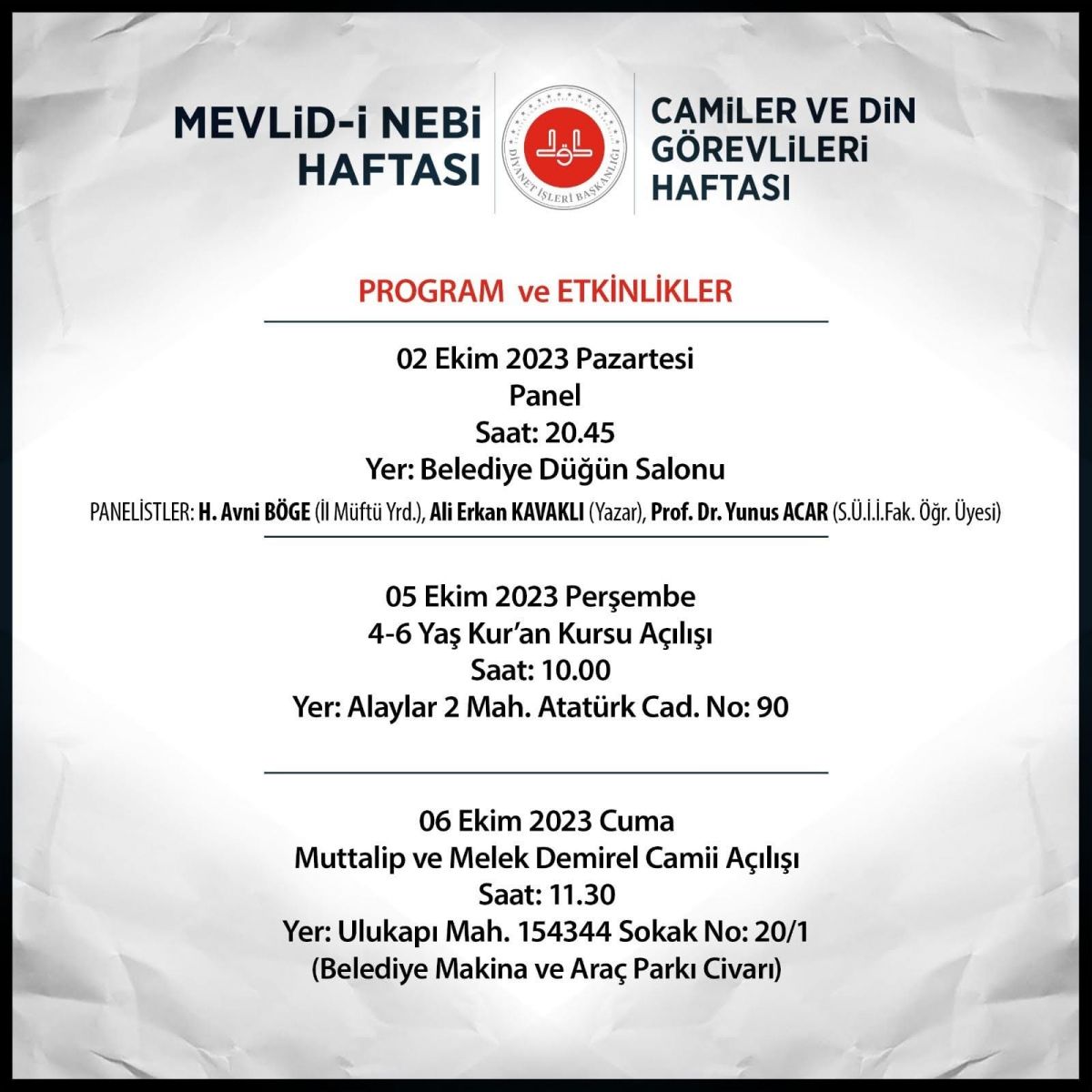 Seydişehir Müftüsü Adem Bebek “Diyanet İşleri Başkanlığımız 2023 yılı Mevlid-i Nebi, Camiler ve Din Görevlileri haftası konusunu ‘peygamberimiz, iman ve istikamet’ olarak belirlemiştir. Tüm hafta boyunca bu konu da gündeme alınacak ve işlenecektir. Seydişehir Müftülüğü olarak bu etkinliklerimiz arasında okullarda öğrenci kardeşlerimize yönelik konferans ve söyleşiler, genç kardeşlerimiz ve tüm vatandaşlarımızla sabah namazı buluşmaları, KYK gençlerimize yönelik konferans, tüm halkımıza yönelik panel, ayrıca Ahmet-Fatma Yılmaz 4-6 Yaş Kur'an Kursu'nun ve Muttalip ve Melek Demirel Camii'nin açılışı planlanmıştır. Gerçekleştirilmesi planlanan etkinliklerden bir kısmı davetiyemizdedir.
