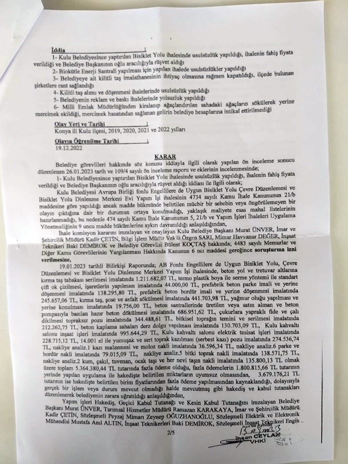 Bilirkişi raporunda ise, Kulu Belediyesi Avrupa Birliği Fonlu Engellilere de Uygun Bisiklet Yolu Çevre Düzenlemesi ve Bisiklet Yolu Dinlenme Merkezi Evi Yapım İşi ihalesinde 5 milyon 364 bin 380 lira fazla ödeme olduğu, gerçek bir işlem veya durum mevcut olmadığı halde mevcutmuş gibi hakkediş ve kabul tutanakları düzenlenerek belediyenin zarara uğratıldığı aktarıldı.
