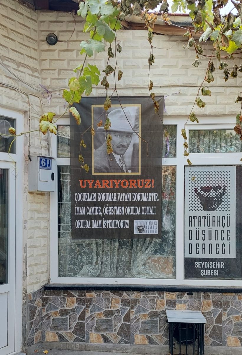 Geçtiğimiz hafta içerisinde öğrendiğimiz üzere ilçemizde bulunan Atatürkçü Düşünce Derneği isimli sivil toplum kuruluşunun şube girişine asmış olduğu bir afiş ile devletimiz ve Diyanet işleri Başkanlığımız tarafından gerçekleştirilen organizasyonlar üzerinden imamlarımızı ve başkanlığımız personellerimizi hedef aldığını ve tehdit ettiğini üzülerek öğrenmiş bulunduk.