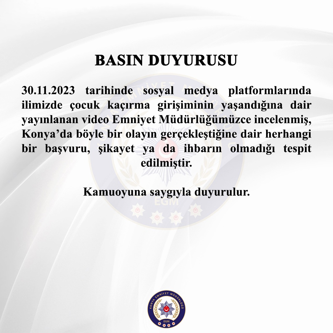 “30 Kasım 2023 tarihinde sosyal medya platformlarında ilimizde çocuk kaçırma girişiminin yaşandığına dair yayınlanan video Emniyet Müdürlüğümüzce incelenmiş, Konya'da böyle bir olayın gerçekleştiğine dair herhangi bir başvuru, şikayet ya da ihbarın olmadığı tespit edilmiştir.”