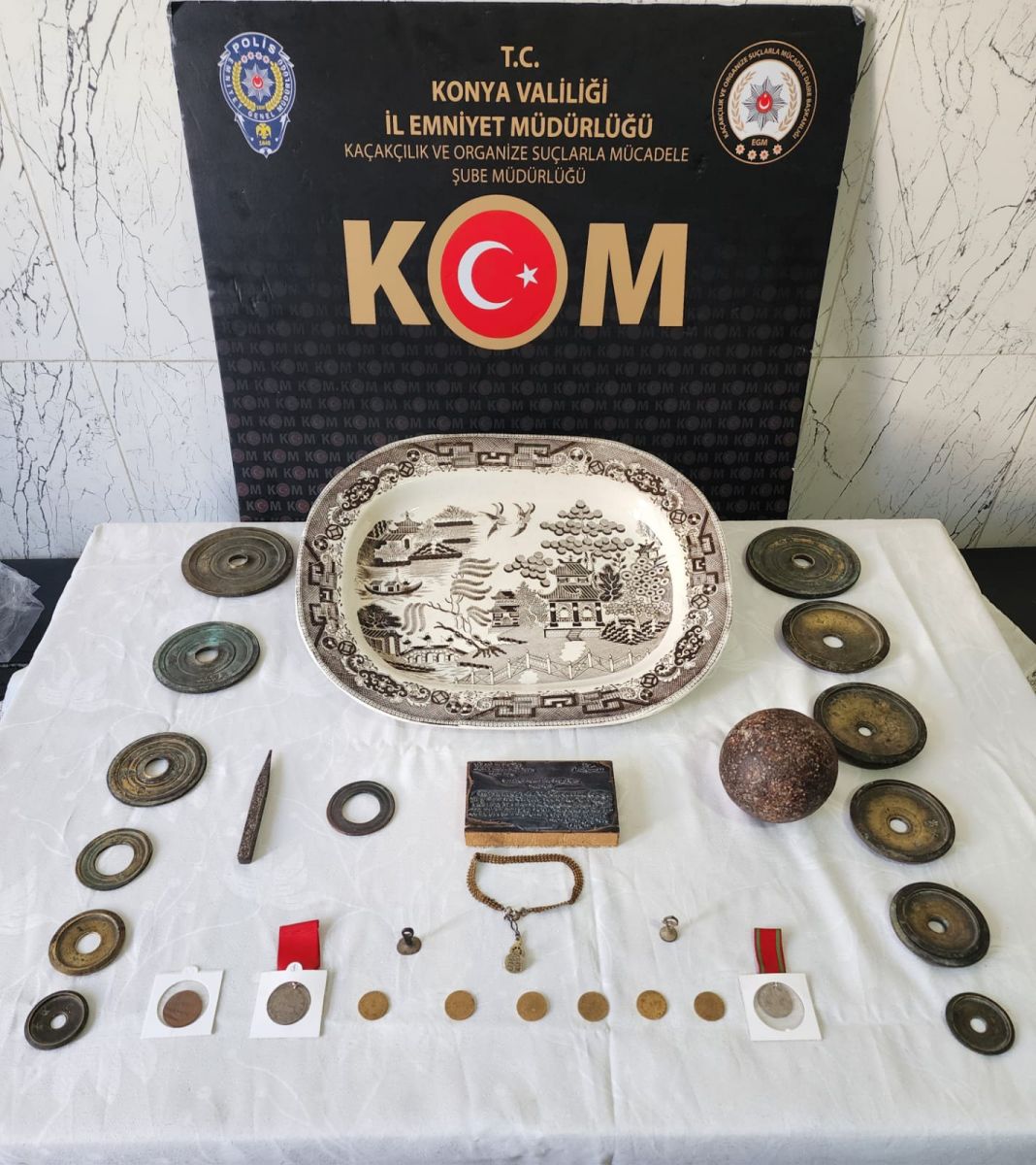 Konya Emniyet Müdürlüğü KOM Şubesi ekipleri tarihi eser kaçakçılarına yönelik çalışmalarını sürdürüyor. Bu kapsamda yapılan çalışmalarda çok sayıda sikke ve tarihi obje ele geçirildi.