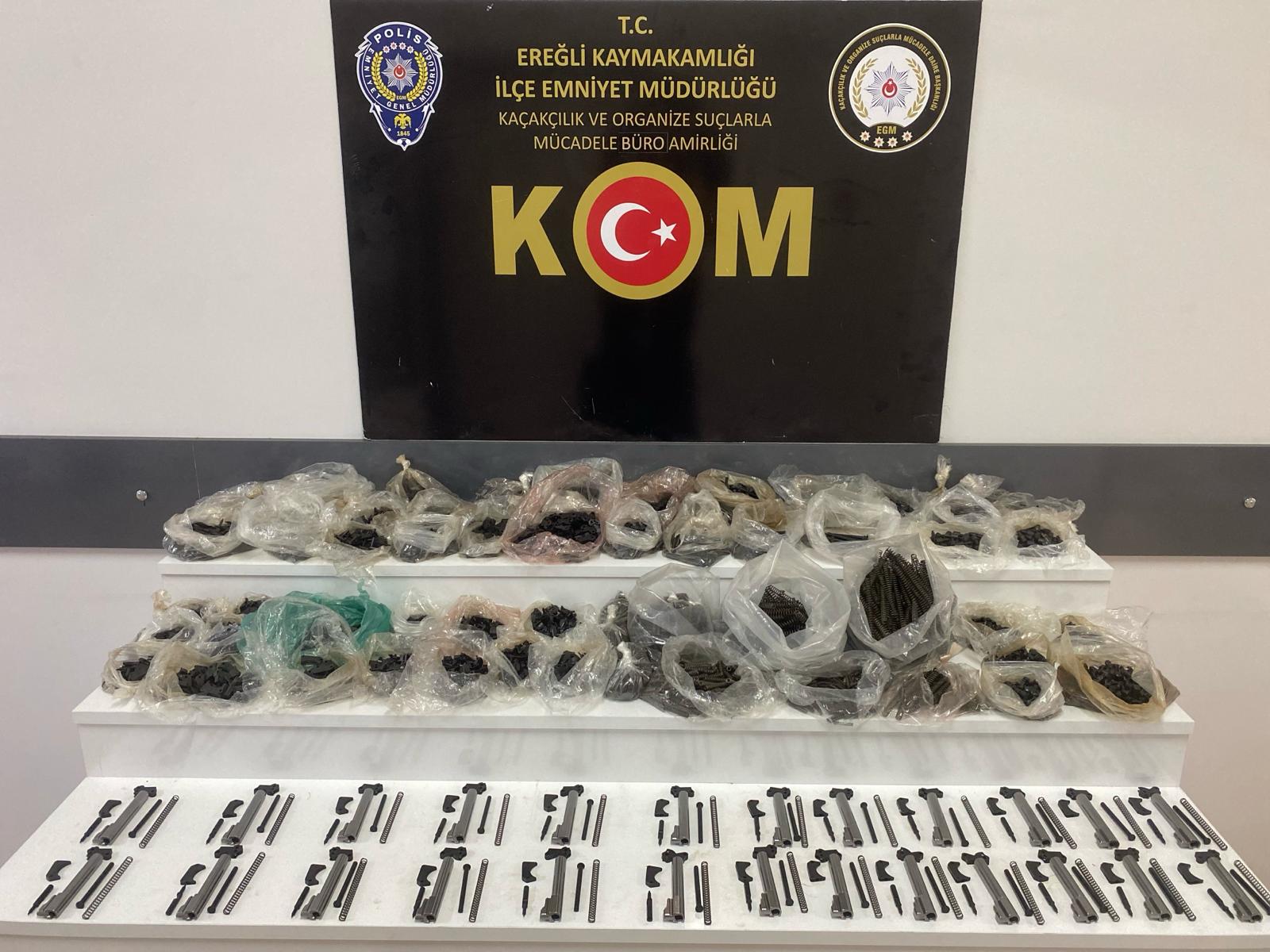 KOM ekiplerince Ereğli İlçesinde silah kaçakçılarına yönelik yapılan çalışmalar neticesinde, 1 araçta yapılan aramada namlu, tetik, horoz, pim, yay vb. 9.165 adet tabanca parçası ele geçirildi. 1 kişi gözaltına alındı.