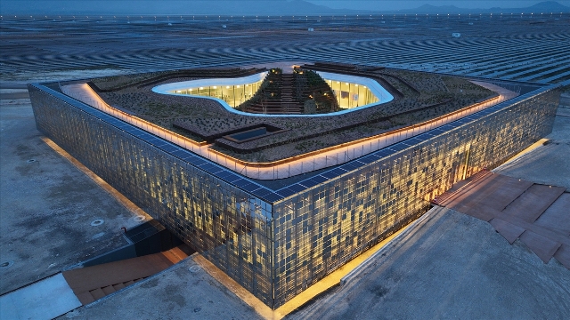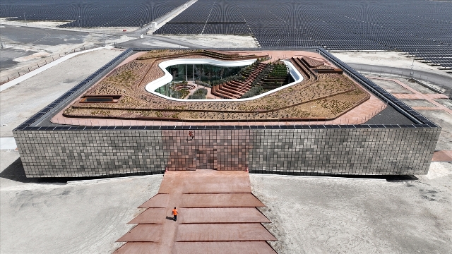 Konya'nın Karapınar ilçesinde bulunan santralin işletilmesi amacıyla bir çok teknik altyapı ve dijital araçlarla donatılan bina, fütürist tasarımıyla dikkati çekiyor.