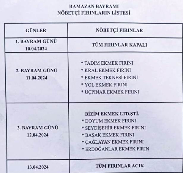İlçemizde faaliyet gösteren ekmek üretiminin yapıldığı fırın veya unlu mamul ruhsatlı işyerleri 2024 yılı Ramazan Bayramının 1. günü kapalı olacak.