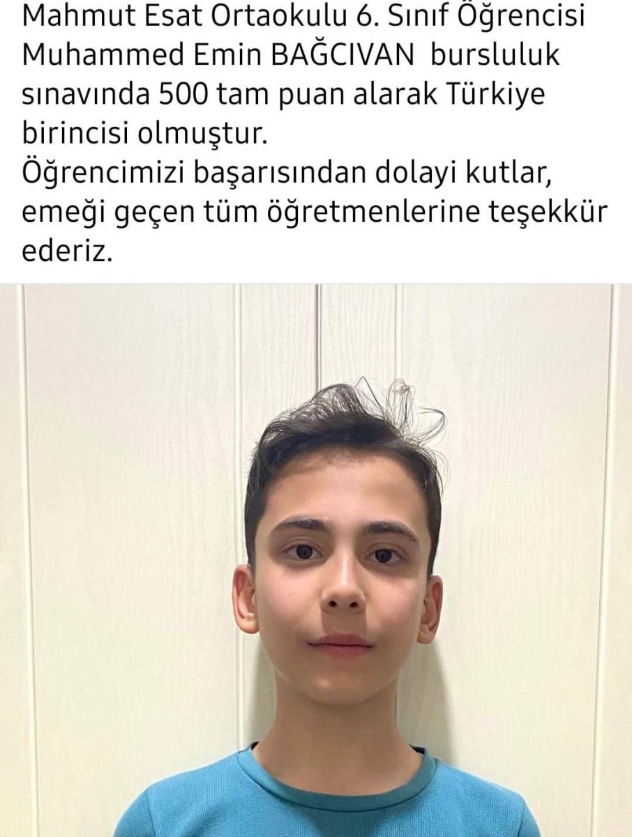 Seydişehir'de bulunan Mahmut Esat Ortaokulu'ndan Muhammed Emin Bağcıvan- Seydişehir İmam Hatip Ortaokulundan 6Sınıf Öğrencisi Yavuz Selim Sezer -Gazi Ortaoklundan 5 Sınıf Öğrencisi Eslem Sena Er-Devlet Parasız Yatılılık ve Bursluluk Sınavı'nda tüm soruları tam cevaplayarak Türkiye birincisi oldular.