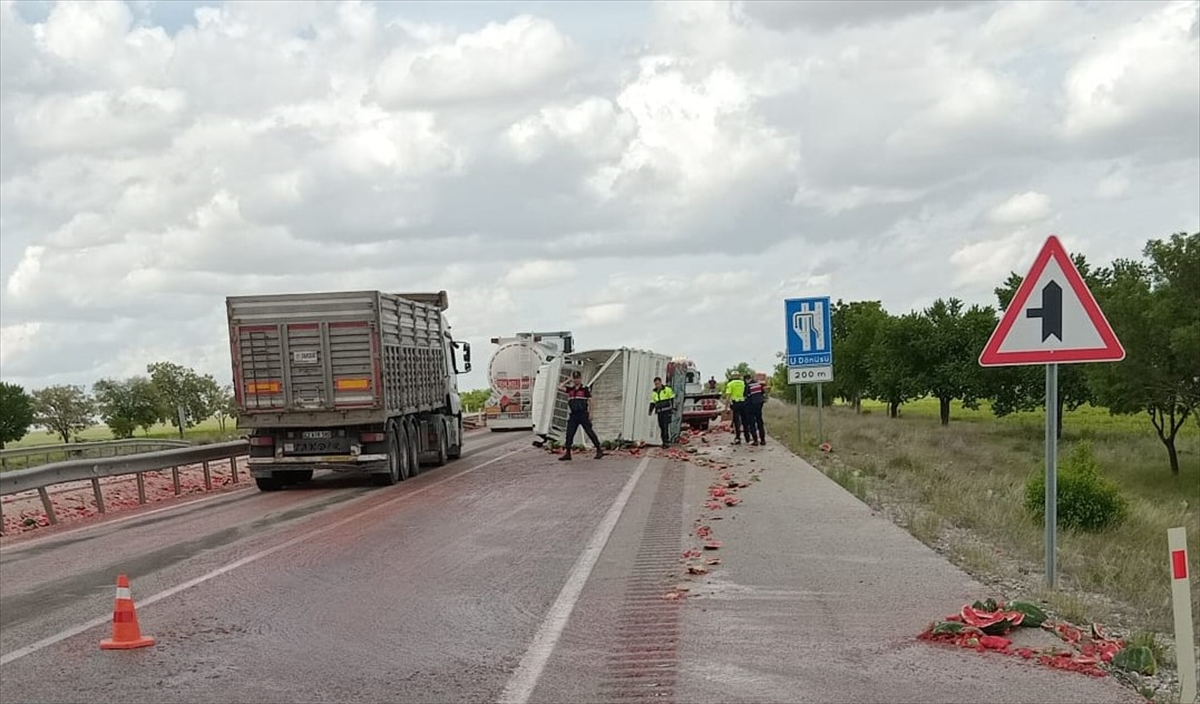 Suat D. idaresindeki 40 GB 569 plakalı karpuz yüklü kamyonet, Ankara-Konya kara yolunun 123. kilometresinde refüje çarparak devrildi.