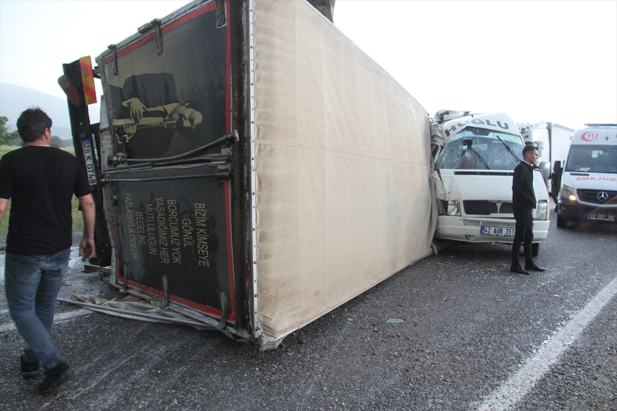 KONYA (AA) - Konya'nın Beyşehir ilçesinde devrilerek karşı şeride geçen kamyonla minibüsün çarpıştığı kazada 14 kişi yaralandı.