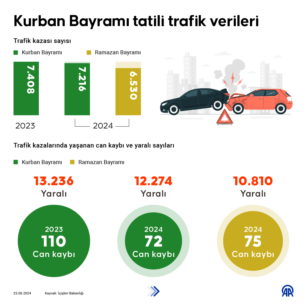 Yerlikaya, 2023 Kurban Bayramı'nda 110 can kaybı, 13 bin 236 yaralı, 2024 Ramazan Bayramı'nda 75 can kaybı, 10 bin 810 yaralı olduğunu belirterek, "2024 Kurban Bayramı'nda maalesef 72 can kaybımız ve 12 bin 274 yaralımız var." dedi.