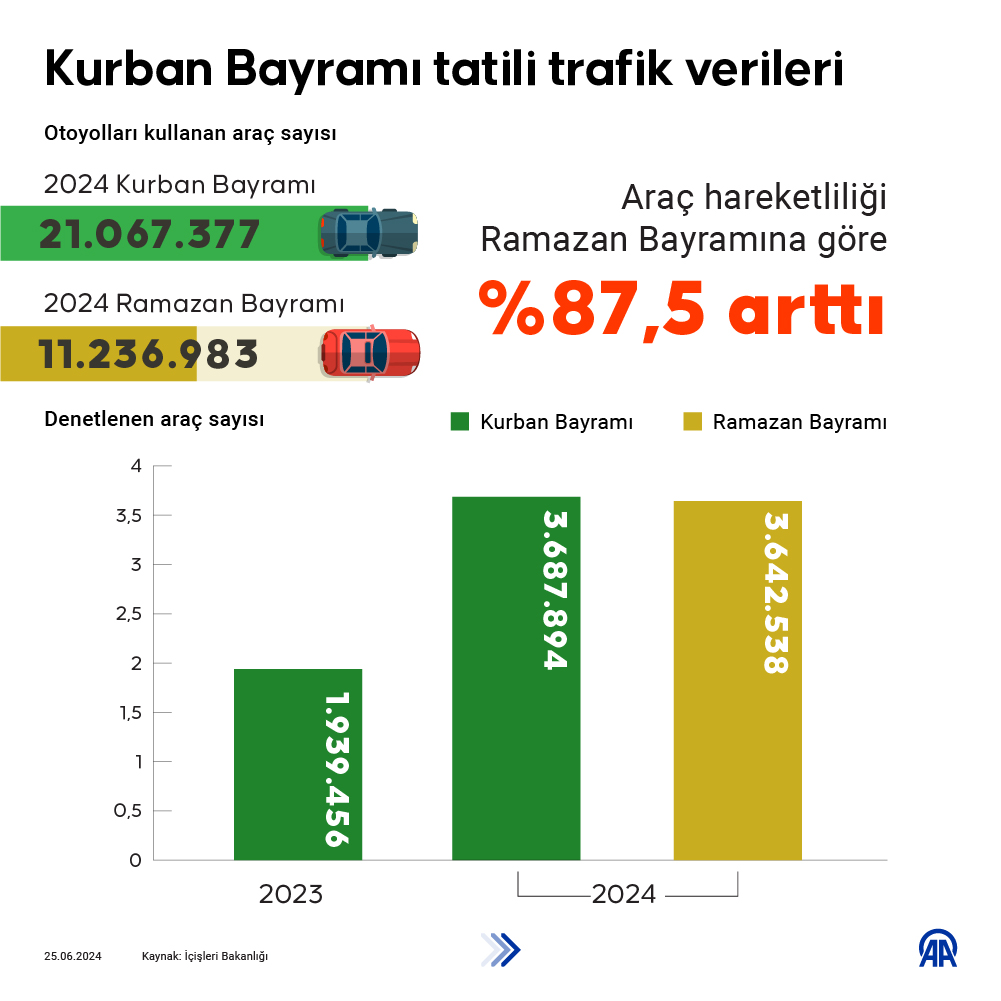 Bakan Yerlikaya, Kurban Bayramı tatilinde trafik denetimlerinde 66 bin 92 personelin görevlendirildiği bilgisini vererek, "2023 Kurban Bayramı'nda 1 milyon 939 bin araç denetlendi. 2024 Kurban Bayramı'nda 3 milyon 687 bin 894 araç denetlendi. Ramazan Bayramı'ndaki denetimlerle de biz aynı rakamı yakaladık." şeklinde konuştu.