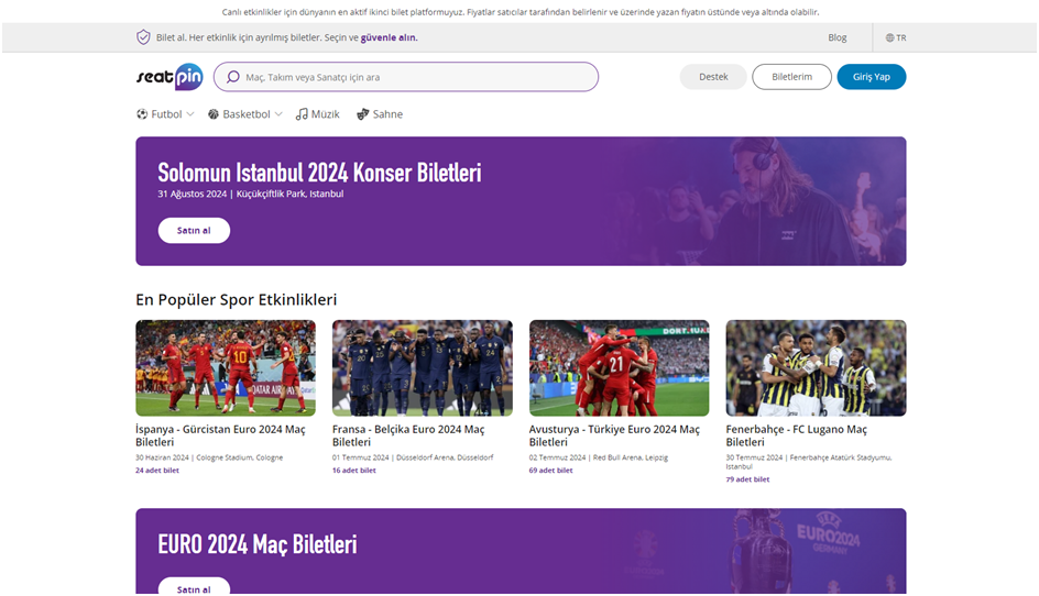 Seatpin, her dönem sporseverlerin bilet ihtiyaçlarınıza yanıt veren bir platformdur. EURO 2024 gibi çok büyük organizasyonlardaki maçlar için de buradan bilet almak mümkündür.