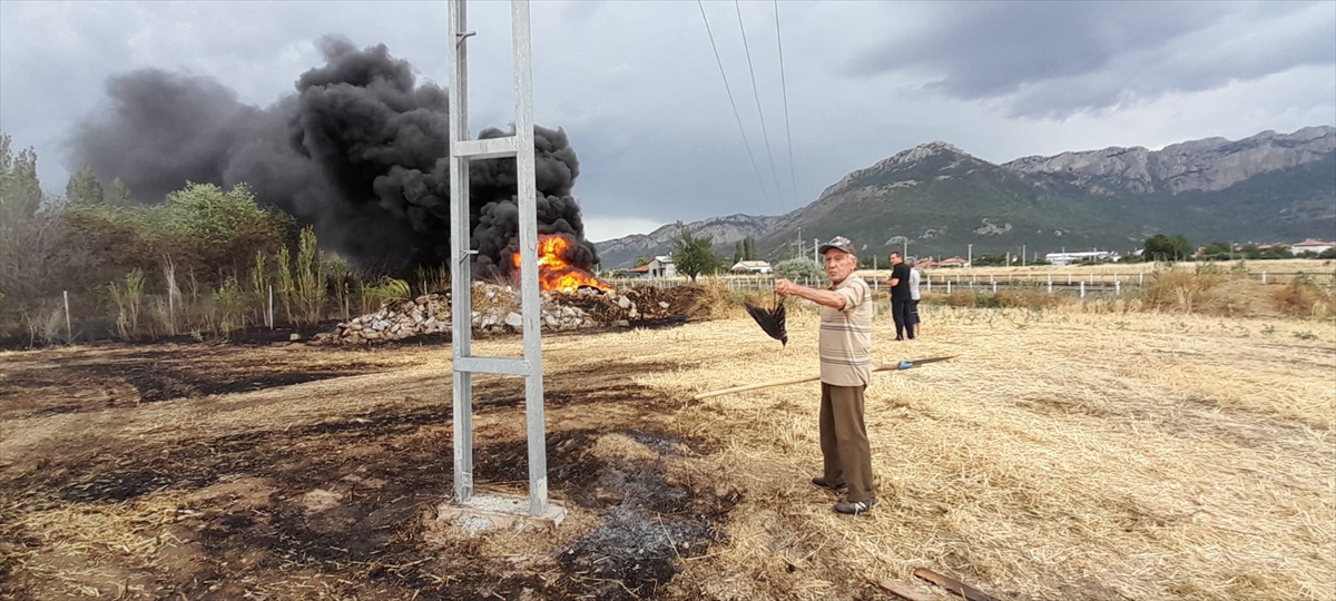 Değirmenci Mahallesi'nde kuşun yüksek gerilim hattına çarpması sonucu çıkan anız yangını, rüzgarın da etkisiyle kısa sürede büyüdü.