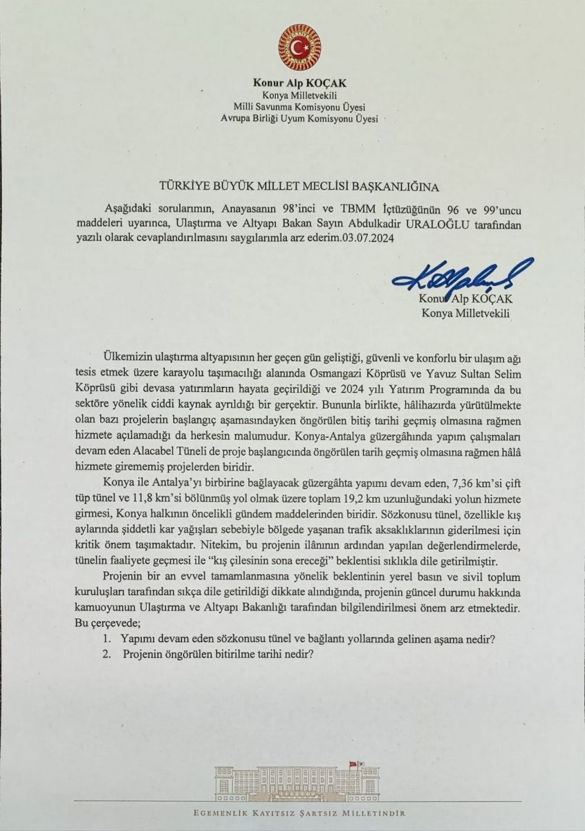 SAYIN MİLLETVEKİLİMİZ GEÇTİMİZ HAFTA TÜRKİYE BÜYÜK MİLLET MECLİSİ BAŞKANLIĞINA ULAŞTIRMA ALTYAPI BAKANI ABDULKADIR URALOĞLU TARAFINDAN YAZILI OLARAK CEVAPLANDIRMASINI SAYGILARIMLA ARZ EDERİM İFADELERİYLE SORU ÖNERGİNİ VERDİ.