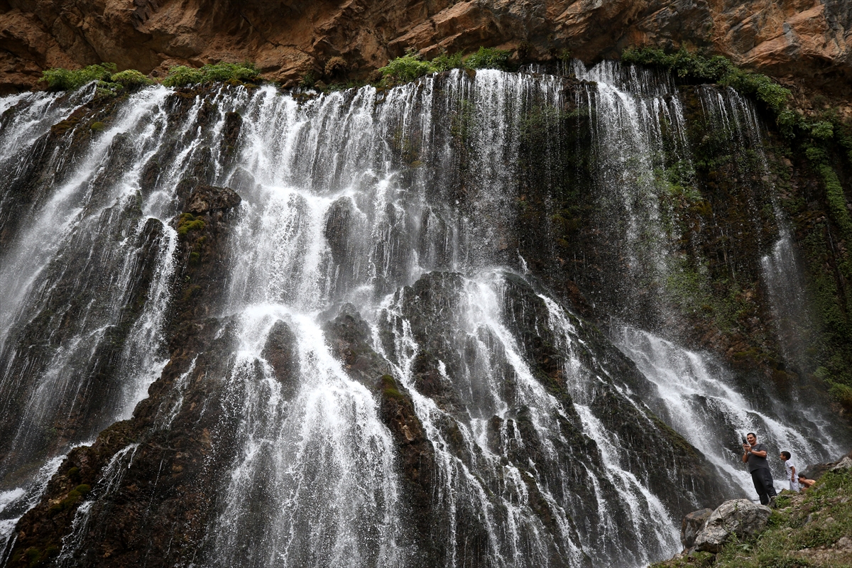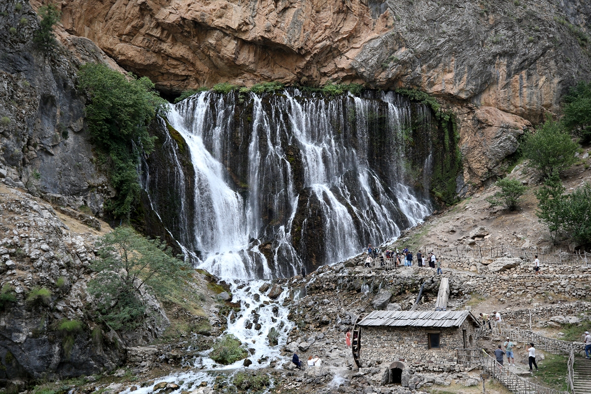 KAYSERİ (AA) - MÜZAHİM ZAHİD TÜZÜN - Kayseri'nin Yahyalı ilçesinde kar kütleleri ve buzullardan beslenen Kapuzbaşı Şelaleleri'ni ziyaret edenler, suyun oluşturduğu serin havanın keyfini çıkarıyor.